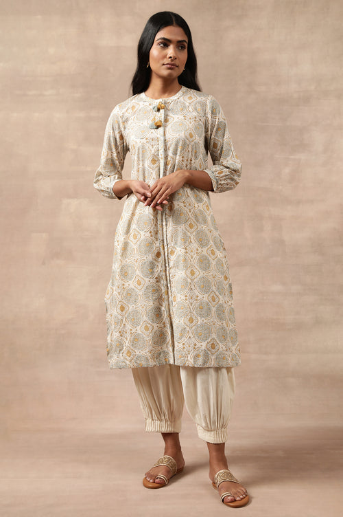 Ecru Hand Block Print Shirtdress In Soft Cotton Voile With Gathered Sleeves. Enhanced With Multicoloured Handmade Tassels At Placket.