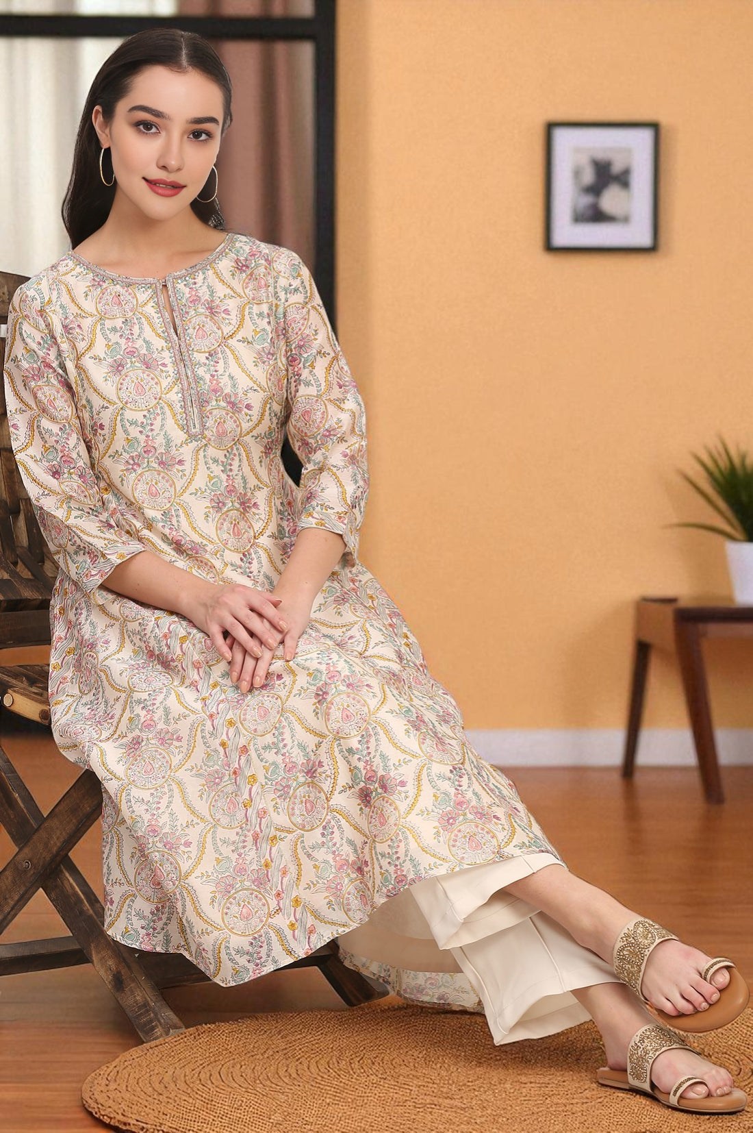 Refined, graceful, and versatile, this cream-coloured cotton silk kurta for women by Folksong exudes festive elegance. Crafted in a breathable cotton blend with 82% cotton and 18% silk, the kurta lends a soft, smooth finish and natural sheen. Designed in a flattering straight silhouette, it features a round neck, 3/4th regular sleeves, and knee-length hemline without slits. The garment is elevated with elegant floral prints and subtle metallic embroidery, enhancing its traditional charm. A woven structure and button closure give it tailored finesse, while its Sandshell colour palette makes it an effortless match with vibrant or neutral bottoms. Ideal for festive occasions or family celebrations, this kurta pairs sophistication with comfort, making it a cherished addition to any ethnic wardrobe.