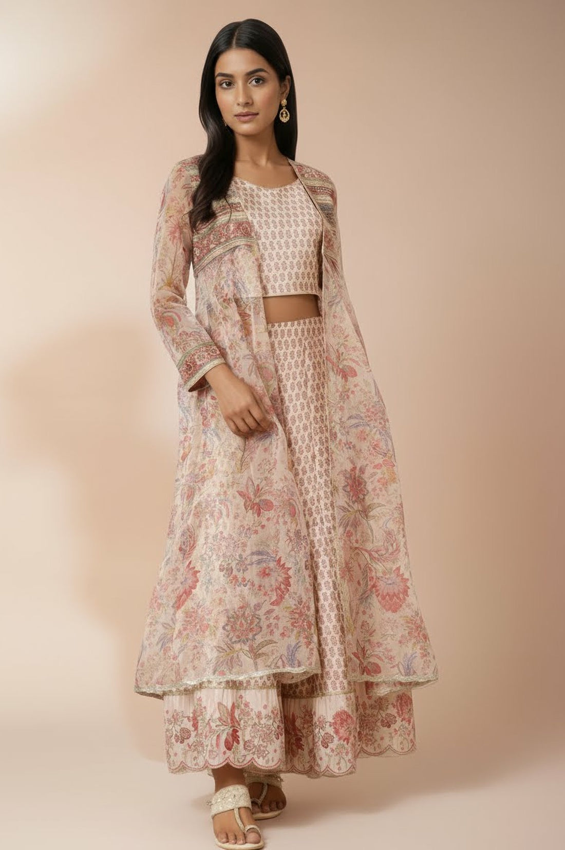 Step into effortless elegance with this stunning Chintz Print Organza Gilet and Crop Top Set, a contemporary twist on traditional styling. The lightweight organza gilet features delicate chintz-inspired floral prints and subtle embroidery, adding a touch of refinement and fluidity. It’s perfectly layered over a printed satin crop top that combines comfort with a sleek silhouette. Paired with printed satin culottes, this three-piece ensemble offers a chic fusion of Indo-western aesthetics. Ideal for daytime events, festive brunches, or intimate celebrations, this printed co-ord set for women is a must-have in your modern ethnic wear wardrobe. Style it with minimal jewelry and heels for a standout look that’s light, fresh, and fashion-forward.