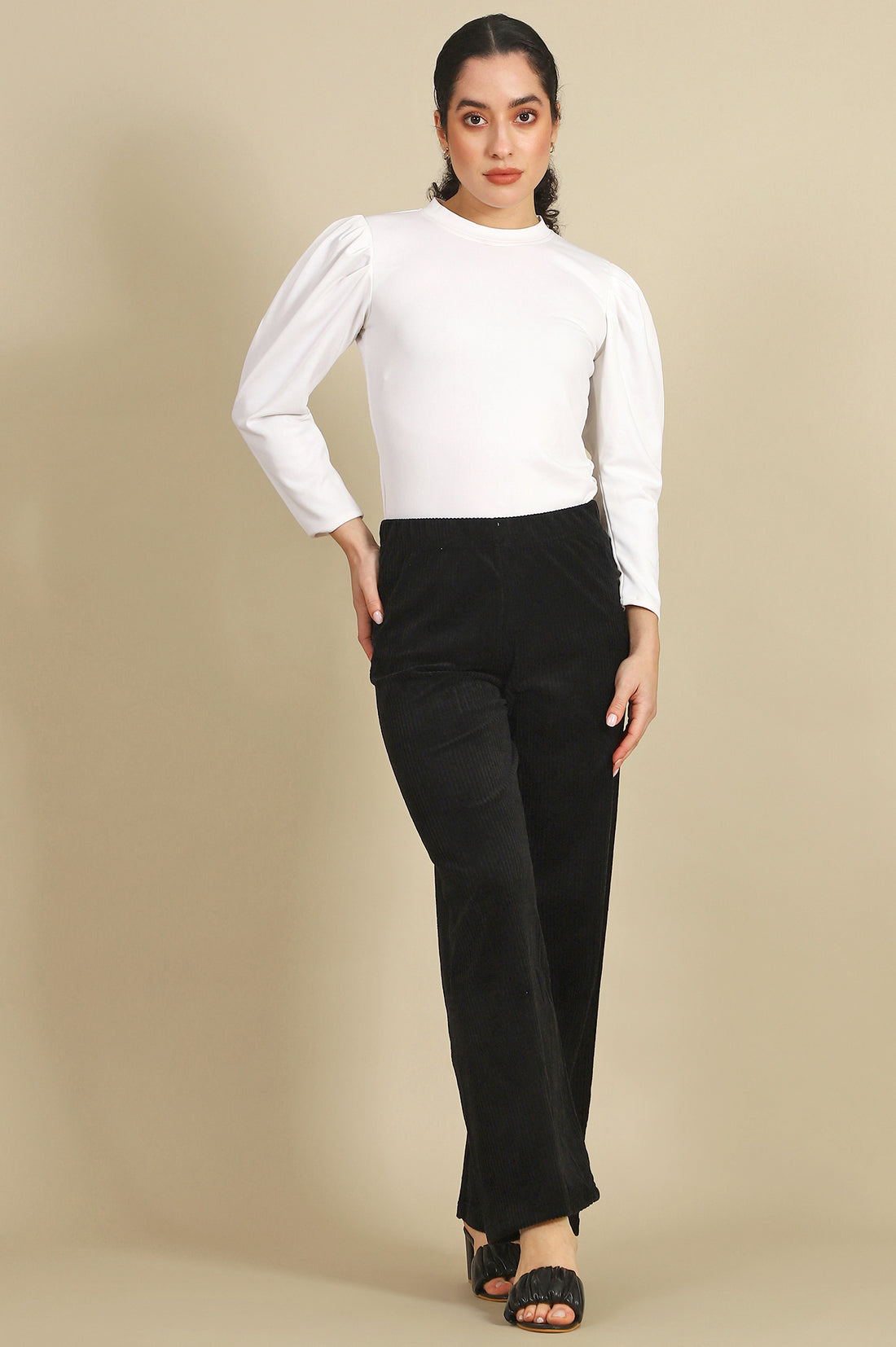 Crafted for effortless style and comfort, these black straight-fit pants are a versatile addition to your wardrobe. Made from a premium cotton blend with a touch of spandex, they offer a soft, breathable feel and just the right amount of stretch for all-day wear. The slip-on closure ensures ease and convenience, while the solid pattern and straight hem create a clean, polished look. Perfect for casual outings or relaxed office settings, these pants pair beautifully with a tucked-in blouse or a fitted tee. Whether you're dressing up or down, these pants are your go-to choice for chic simplicity.