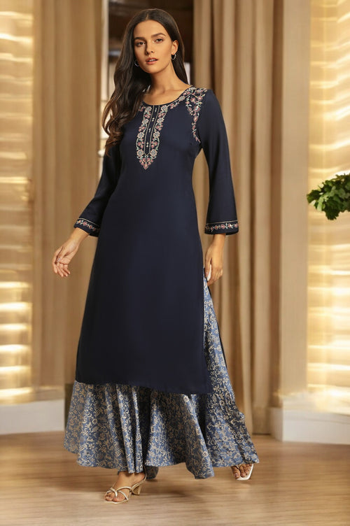 Kurta for women featuring chunky thread embroidery, this blue festive piece creates texture and dimension without excessive weight. The straight cut keeps it polished, while the detailed threadwork adds artisanal appeal suited to evening gatherings and family celebrations. A comfortable fabric base makes it easy to wear for hours, and the versatile hue pairs well with metallics or soft neutrals. Add slim trousers for structure or palazzos for movement. Dress it up with a metallic clutch for an elegant finish.