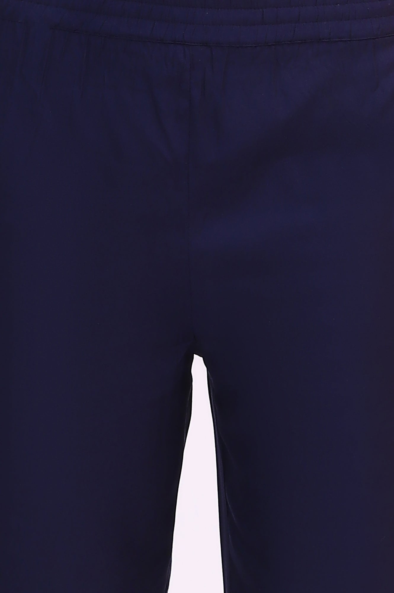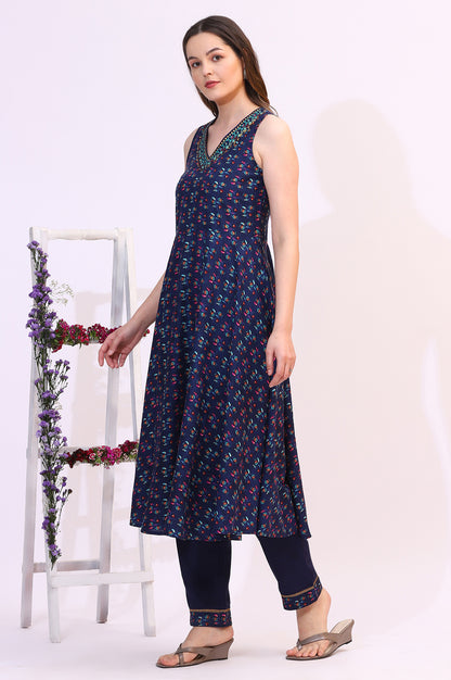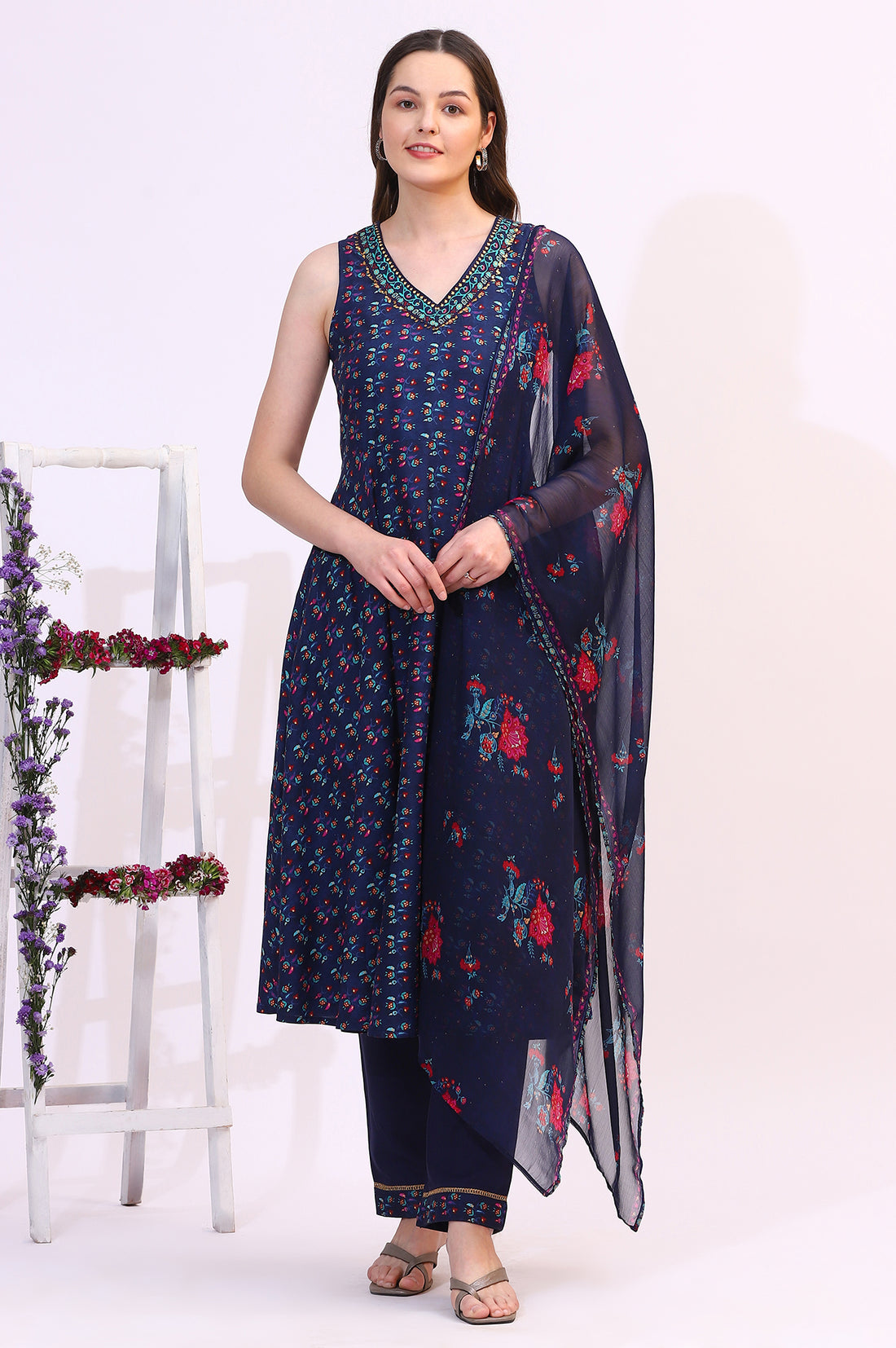 This stunning deep blue sleeveless circular Anarkali kurta is a perfect blend of elegance and contemporary charm. Adorned with a delicate floral foil print, it exudes a regal appeal with a graceful, flowy silhouette. The metallic sequin detailing adds a subtle shimmer, while the intricately designed border print on the neckline enhances its refined beauty. Paired with tonal solid straight pants for a balanced look, the ensemble is completed with a beautifully printed drape, adding an extra layer of sophistication. Ideal for festive gatherings, evening celebrations, or special occasions, this set offers a timeless yet modern appeal.