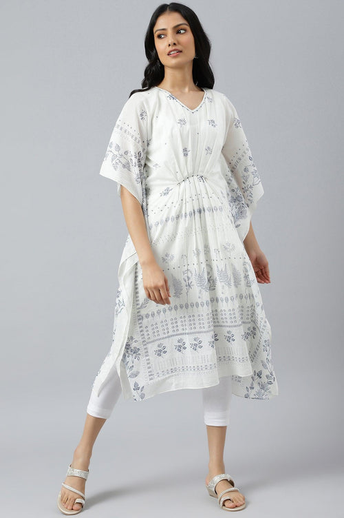 Experience the perfect blend of comfort and style with this exquisite ethnic v-neck kurta. Crafted from 100% pure cotton, this white garment offers unparalleled breathability and softness against your skin. The woven construction technique ensures durability and a refined finish. Featuring elbow-length sleeves, this straight-cut kurta boasts a delightful floral print that adds a touch of elegance to your casual wardrobe. The versatile design makes it suitable for various informal occasions, allowing you to showcase your ethnic flair with ease. Embrace the beauty of traditional craftsmanship combined with modern aesthetics in this charming cotton kurta that promises both comfort and style for your everyday wear.