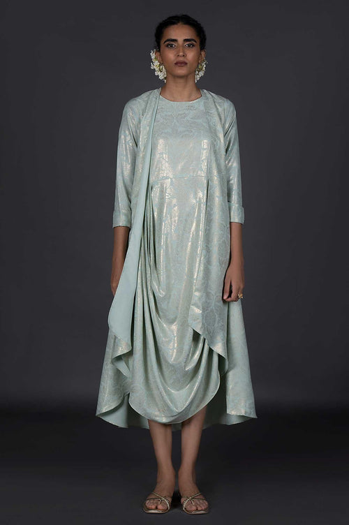 Add a playful twist to your festive collection with this green printed dress featuring mock-layered detailing and a cowl hem. Crafted in soft viscose, the design is fluid and flattering with an artistic edge. Perfect for cocktail nights and semi-formal occasions, it brings together print, movement, and structure seamlessly. The festive tones and dynamic silhouette make it a vibrant choice for the season.