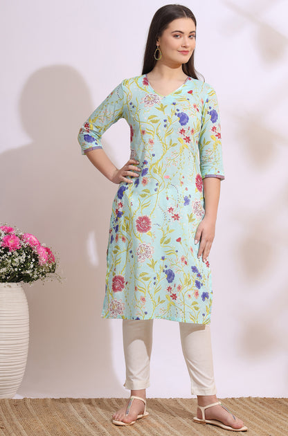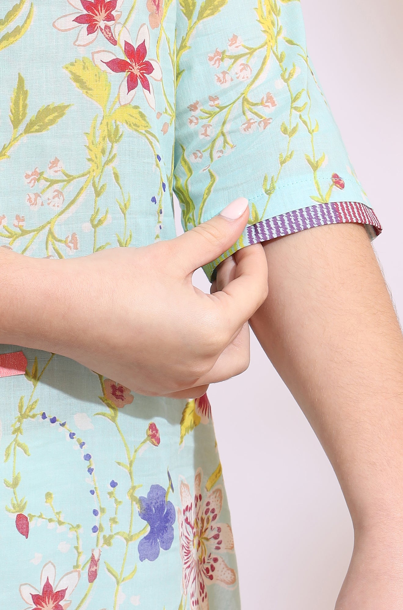 This Kurta crafted in Cotton Cambric is a refreshing and comfortable piece, ideal for casual outings or semi-formal occasions. The soft cotton cambric fabric ensures breathability and comfort, making it a perfect choice for warmer weather. The light blue base is beautifully adorned with delicate floral prints that add a touch of freshness and femininity to the design. The straight-cut silhouette gives it a modern and clean look, while the piping detail along the edges adds subtle definition and enhances the overall structure of the kurta. This combination of comfort, style, and intricate detailing makes it a versatile piece for day-to-day wear.