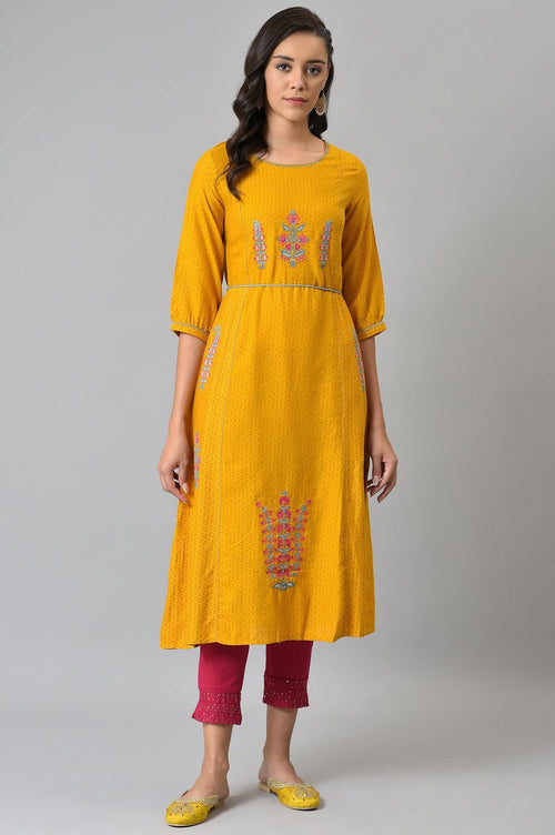 Mustard Yellow A-Line Printed kurta With Embroidery - wforwoman