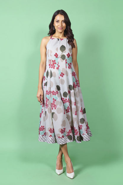 This elegant off-white spaghetti dress features a flattering panelled silhouette, designed to enhance grace and movement. Crafted from lightweight nylon cotton kota, it offers breathability and a soft, airy feel. The dress is adorned with a vibrant multicolor floral print, adding a fresh and lively touch. Delicate contrast beadwork further enhances its charm, creating a subtle yet striking embellishment. Perfect for daytime events or summer soirées, this dress exudes effortless elegance and contemporary sophistication.