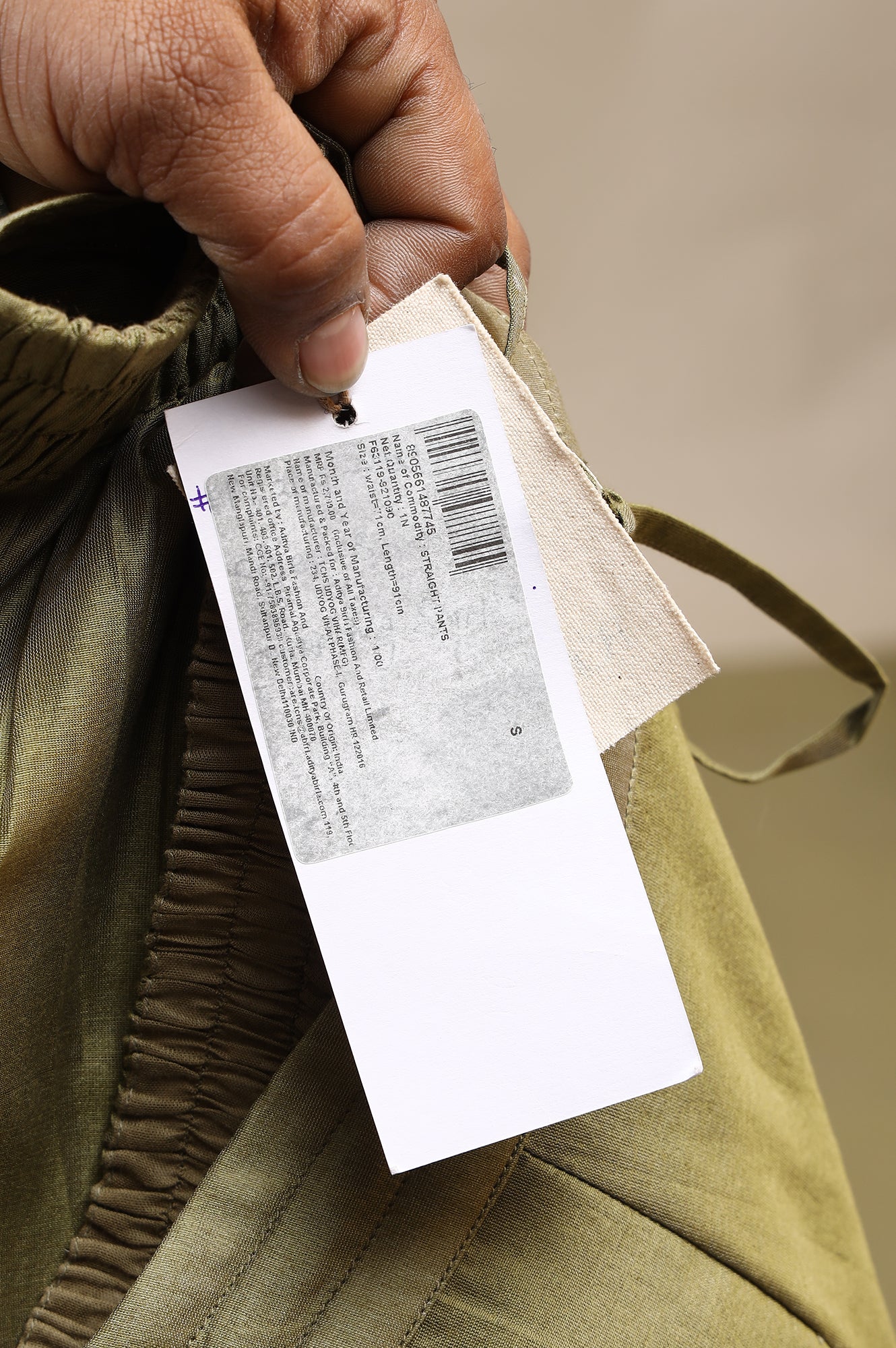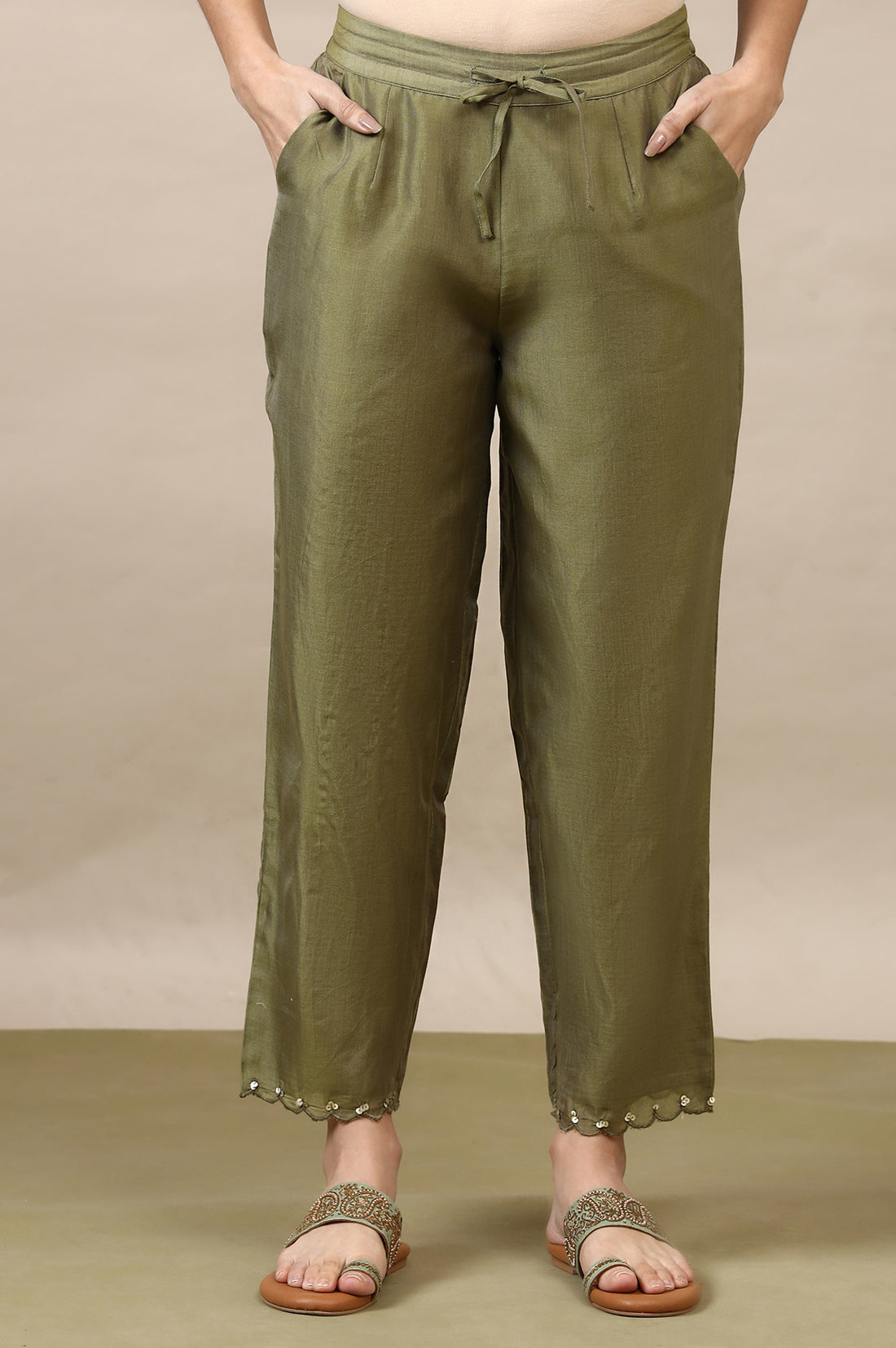 Pistachio green straight pants crafted in cotton silk, featuring delicate scallop detailing and sequins at the hem. Lined with soft voile for comfort, the design includes functional side pockets and offers a perfect fit with a drawstring and elasticated waistband at the back.