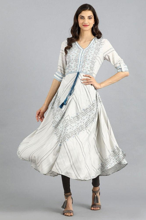 Grey v-neck kurta with printed detail.