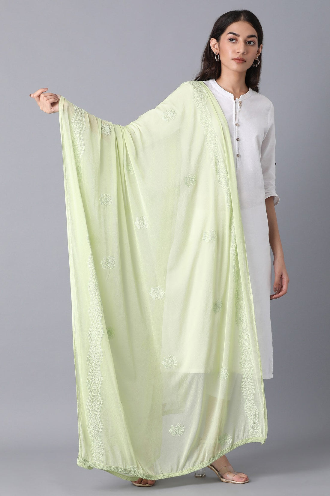Pista green silver chiffon dupatta with embroidery and lace border.