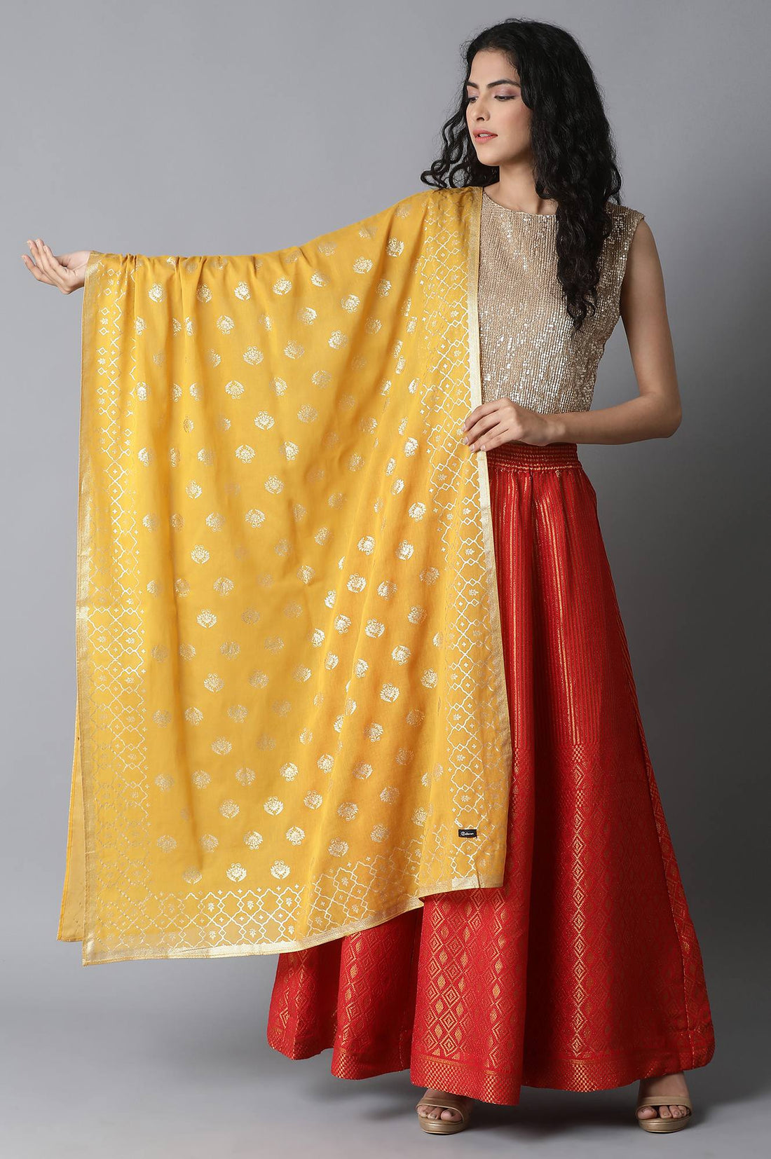 Yellow printed dupatta in cotton fabric in foil print with floral pattern.