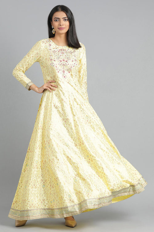 Make a statement at special occasions with this ethnic dress, designed for festive activities. Featuring a classic round neckline, its woven construction ensures both elegance and comfort. This dress is ideal for women who appreciate ethnic fashion and want to stand out at festive gatherings. Its ethnic charm and stylish design make it a versatile addition to any wardrobe. Whether you're attending a special occasion or simply want to add a touch of tradition to your style, this dress offers a perfect blend of elegance and ethnic flair. It's the perfect blend for an Indo-western outfit. Pair it with stylish sandals, and you're ready to step out in effortless elegance.