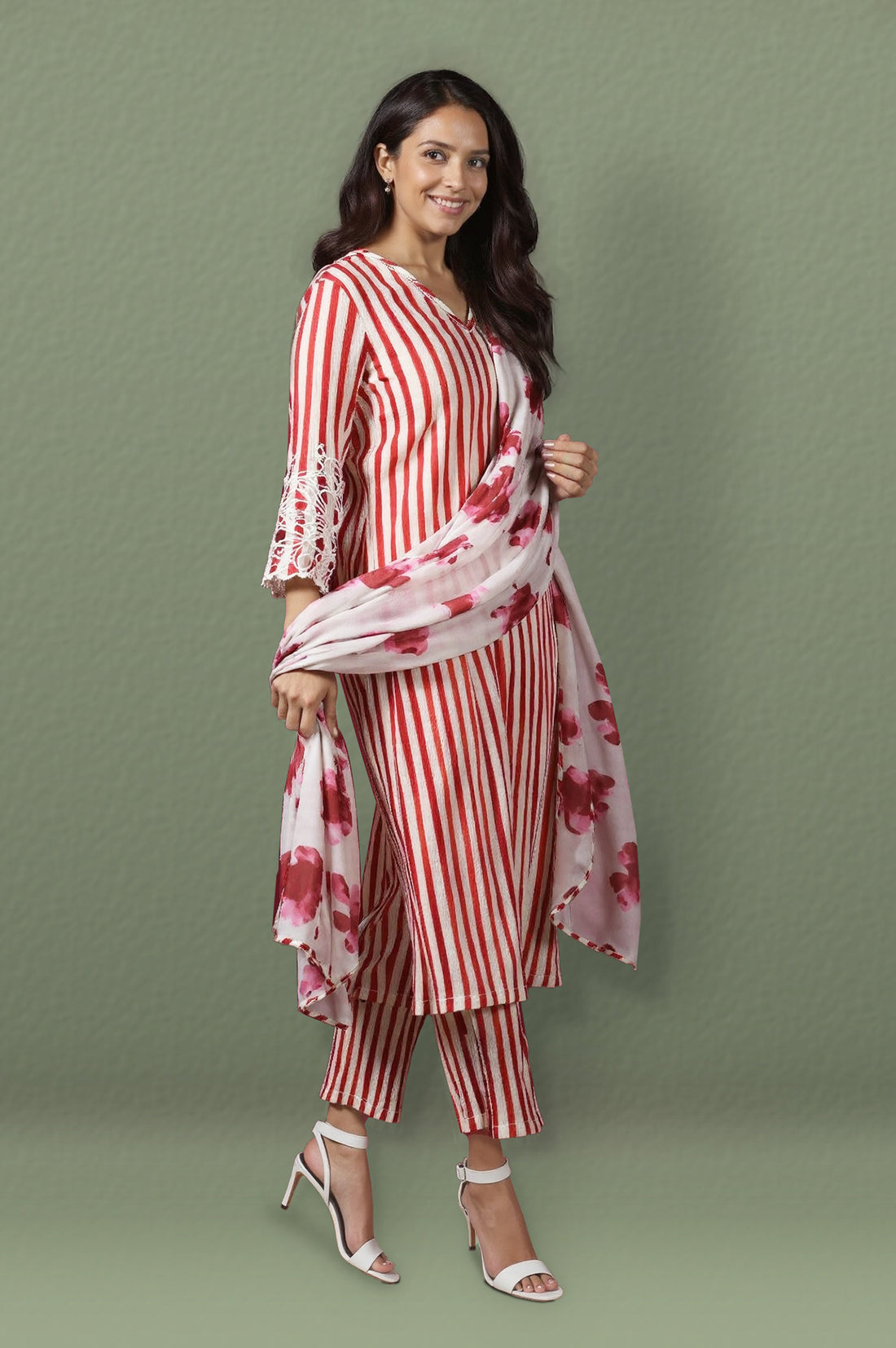 White & red striped straight kurta made in cotton crepe fabric. It is adorned with cutwork embroidery detail. The kurta is paired with striped straight pants and organza floral printed dupatta.