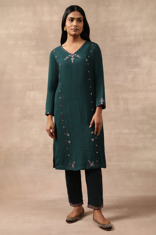 Experience the warmth and elegance of our winter kurta, crafted with meticulous attention to detail. This ethnic masterpiece boasts a straight silhouette in a rich green hue, perfect for elevated occasions. The kurta is expertly woven from 100% wool, ensuring exceptional comfort and insulation during colder months. Its full sleeves and v-neck design add a touch of sophistication, while the intricate embroidery elevates its aesthetic appeal. The wool construction not only provides warmth but also offers breathability and natural moisture-wicking properties. This versatile piece seamlessly blends traditional craftsmanship with contemporary style, making it an ideal choice for those who appreciate both fashion and functionality in their ethnic wear. Whether you're attending a formal event or simply want to make a statement, this winter kurta is sure to turn heads and keep you cozy.
