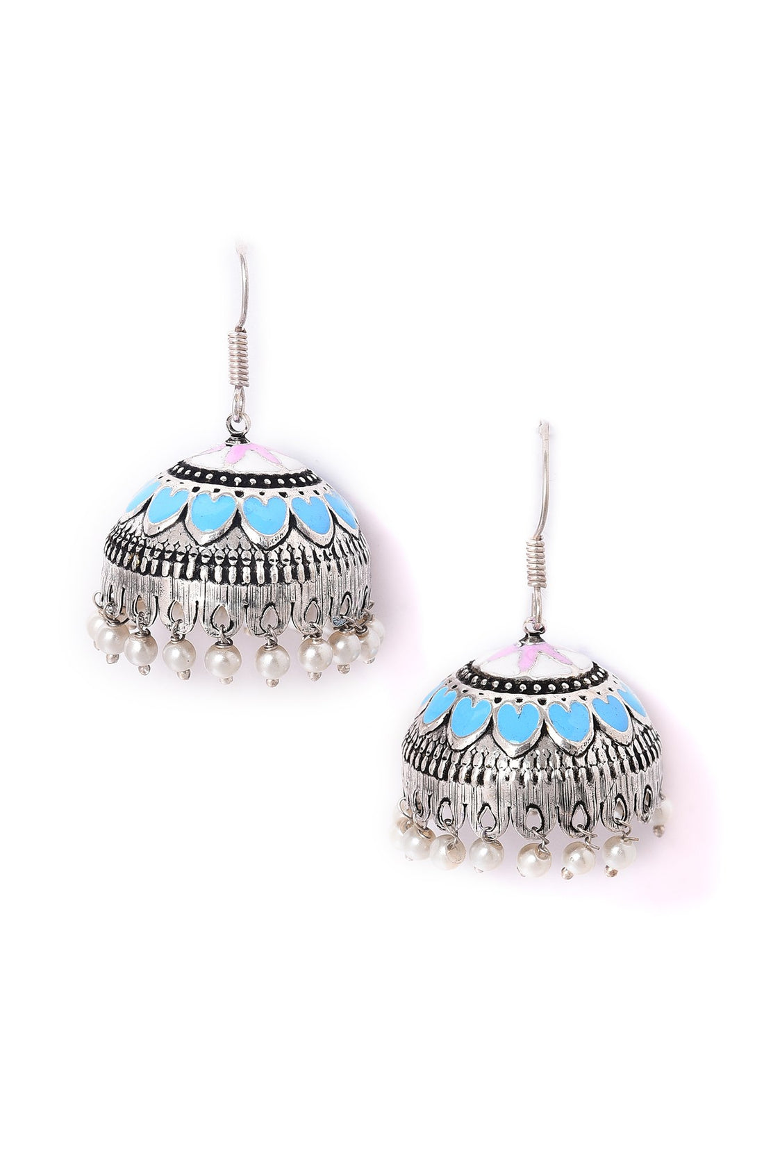 ethnic handcrafted silver jhumki earrings with fine enamel details in blue and pink colour