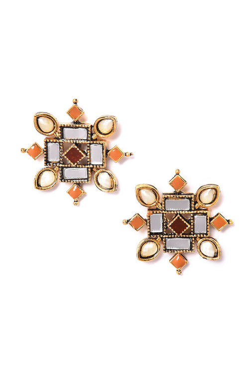 ethnic gold oxidised stud earrings with pearl and mirror details with brown enamel