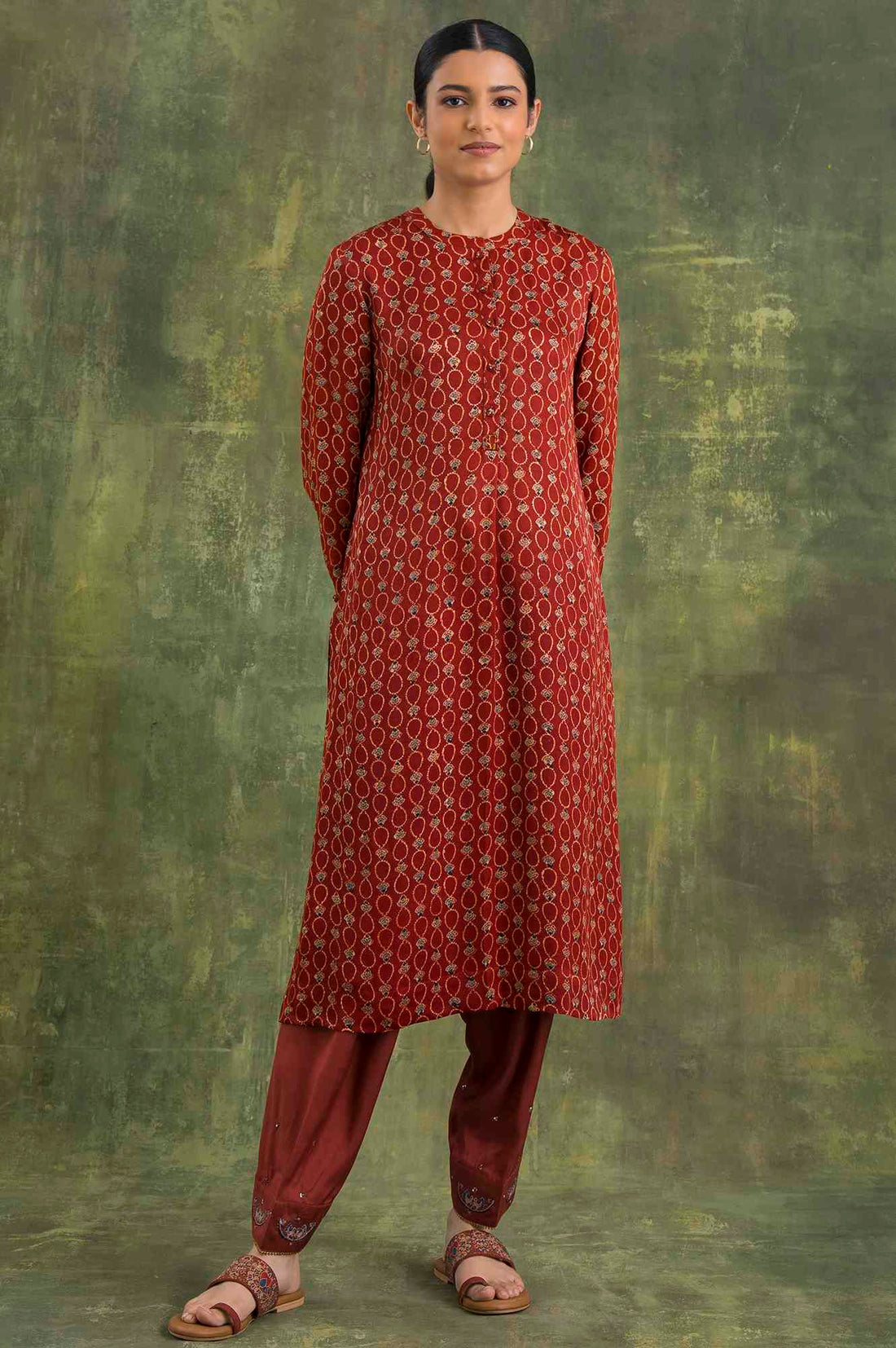 A Shirtdress In Soft And Fluid Satin With Hand Block Ajrakh Printed Booti, Accented With Delicately Embroidered Buttons.