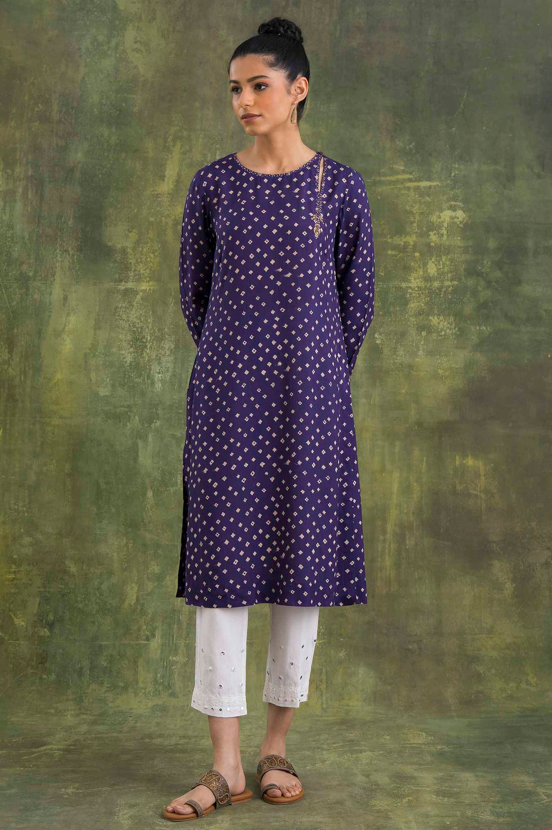 A Straight Fit kurta In Deep Purple With Bandhej Print And Hand Done Zardozi Embroidery Along The Neck And Side Keyhole.