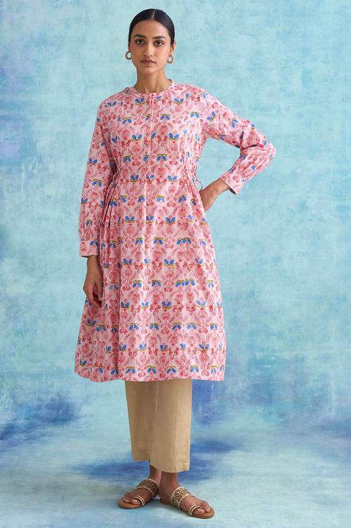 A Voile kurta In Handblock Print, Features Mandarin Collar And Side Gathers. Finished With Tie-Up On Sides And Dainty Embroidery On Placket.