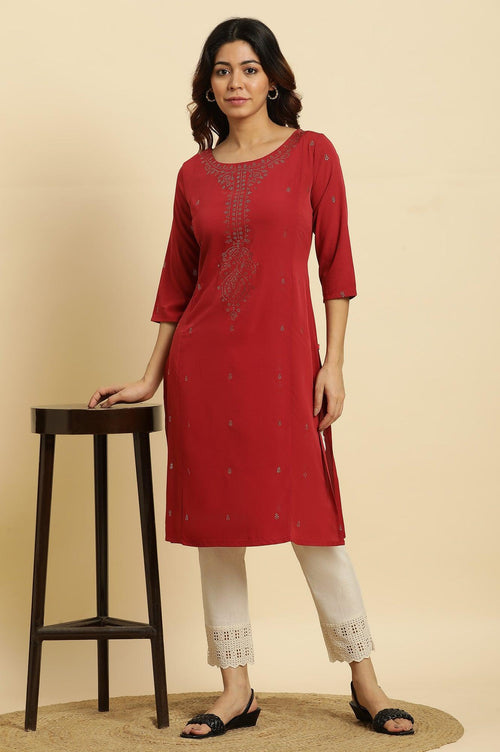 Elevate your style with this exquisite red kurta, perfect for special occasions. Crafted from 100% polyester, this woven piece features intricate embroidery that adds a touch of luxury to your ensemble. The three-quarter sleeves and round neckline create a balanced and flattering silhouette, while the straight cut ensures a comfortable fit. Made using crepe fabric, this kurta drapes beautifully, enhancing your overall look. The ethnic design elements make it a standout choice for cultural events or festive gatherings. The polyester material offers durability and easy maintenance, making it a practical yet stylish option for your wardrobe. Whether you're attending a family function or a formal event, this embroidered kurta will help you make a lasting impression with its refined elegance and attention to detail.