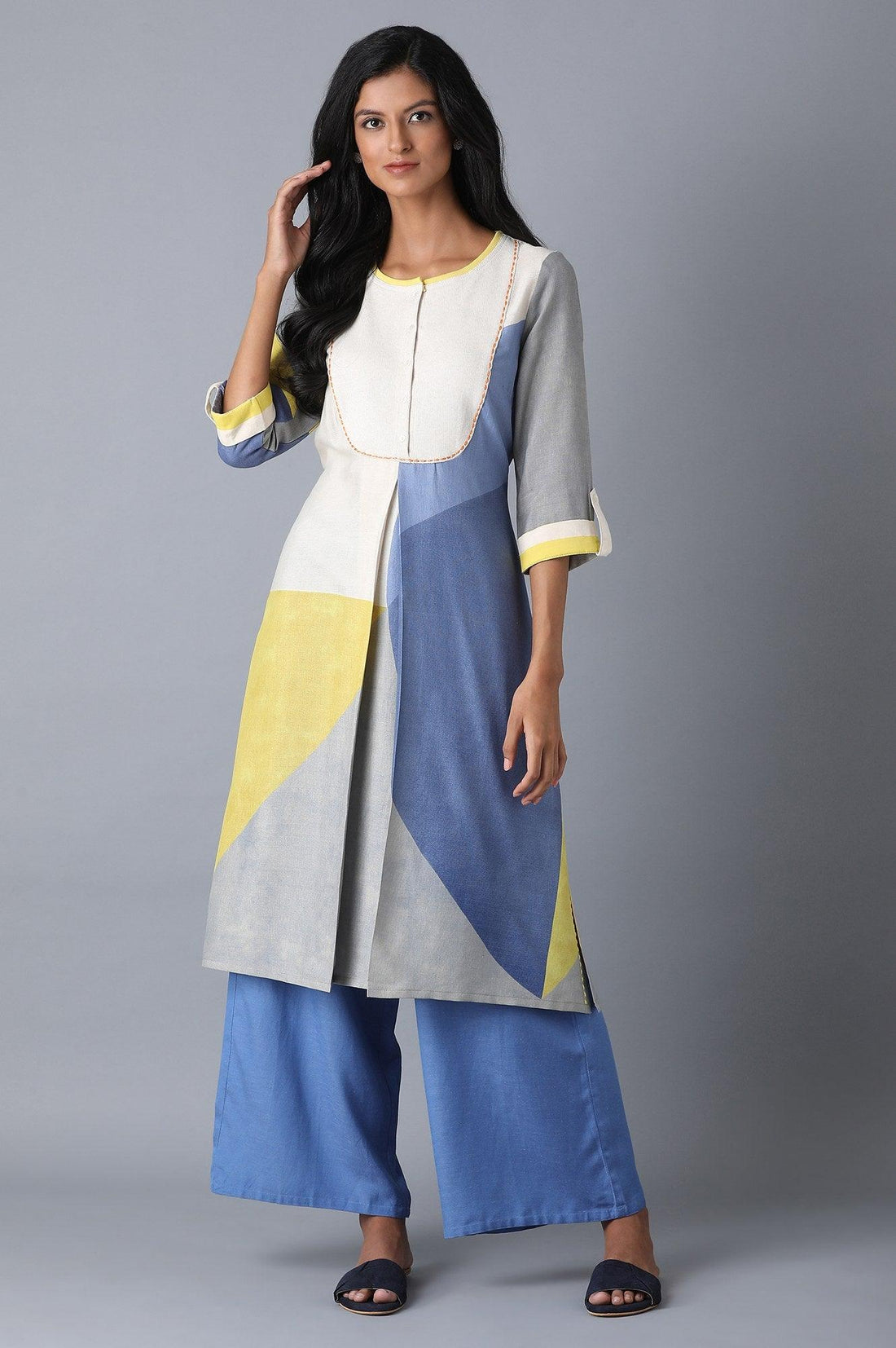 You can pair the kurta with blue flared pants and flats for the complete look.