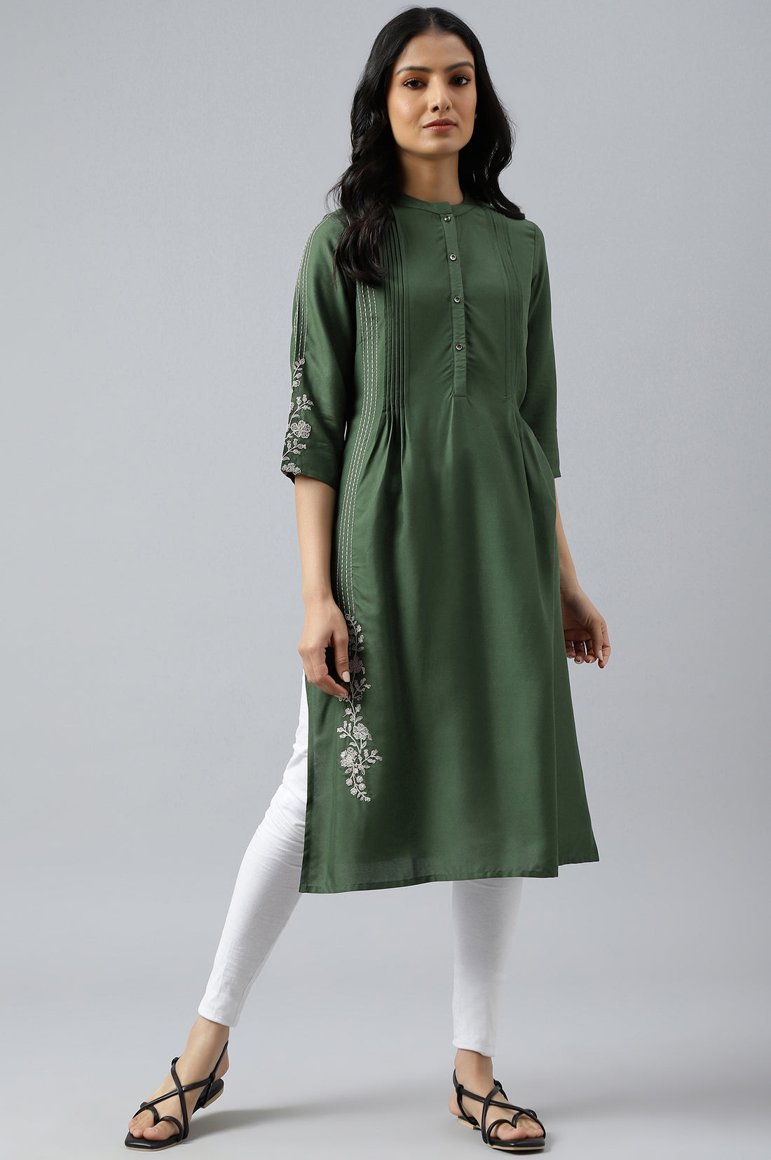 Embrace casual elegance with this green ethnic kurta, perfect for everyday wear. Crafted from 100% viscose, this woven piece offers comfort and style in equal measure. The band neckline adds a touch of sophistication to the overall design, while the three-quarter sleeves provide versatility for various seasons. The straight silhouette of this kurta ensures a flattering fit for all body types. Embellished with intricate embroidery, this piece stands out with its attention to detail. The rayon fabric adds a subtle sheen and enhances the drape of the garment. Ideal for casual outings or relaxed gatherings, this kurta effortlessly blends traditional elements with modern aesthetics. The rich green hue makes it a versatile choice that can be paired with various bottoms, from leggings to palazzos. Whether you're running errands or meeting friends for lunch, this embroidered kurta will keep you looking stylish and feeling comfortable throughout the day.