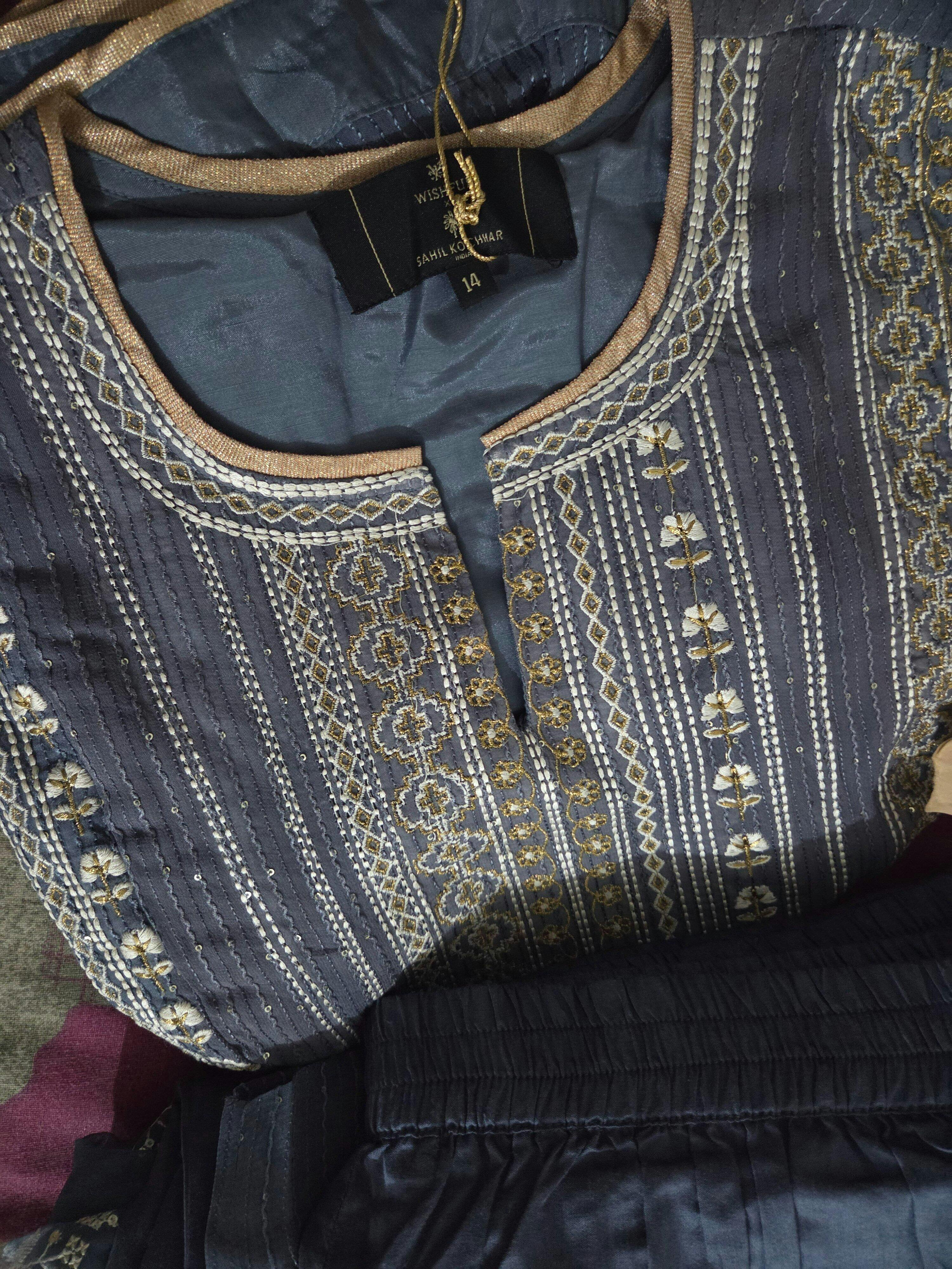 Indulge in the epitome of ethnic elegance with this exquisite grey embroidered ensemble. Comprising a kurta, straight pants, and a dupatta, this set is perfect for special occasions. The kurta features intricate embroidery, adding a touch of luxury and sophistication to your look. Crafted from 100% viscose georgette, the outfit offers a lightweight and flowing silhouette that drapes beautifully. The full sleeves provide coverage and add to the traditional appeal, while the split neckline adds a modern touch. The flared design of the kurta creates a graceful movement as you walk, ensuring you make a lasting impression. The woven construction technique ensures durability and quality, making this outfit a treasured addition to your wardrobe. Whether it's a wedding, festival, or any special event, this grey ensemble will help you stand out with its timeless charm and impeccable craftsmanship.