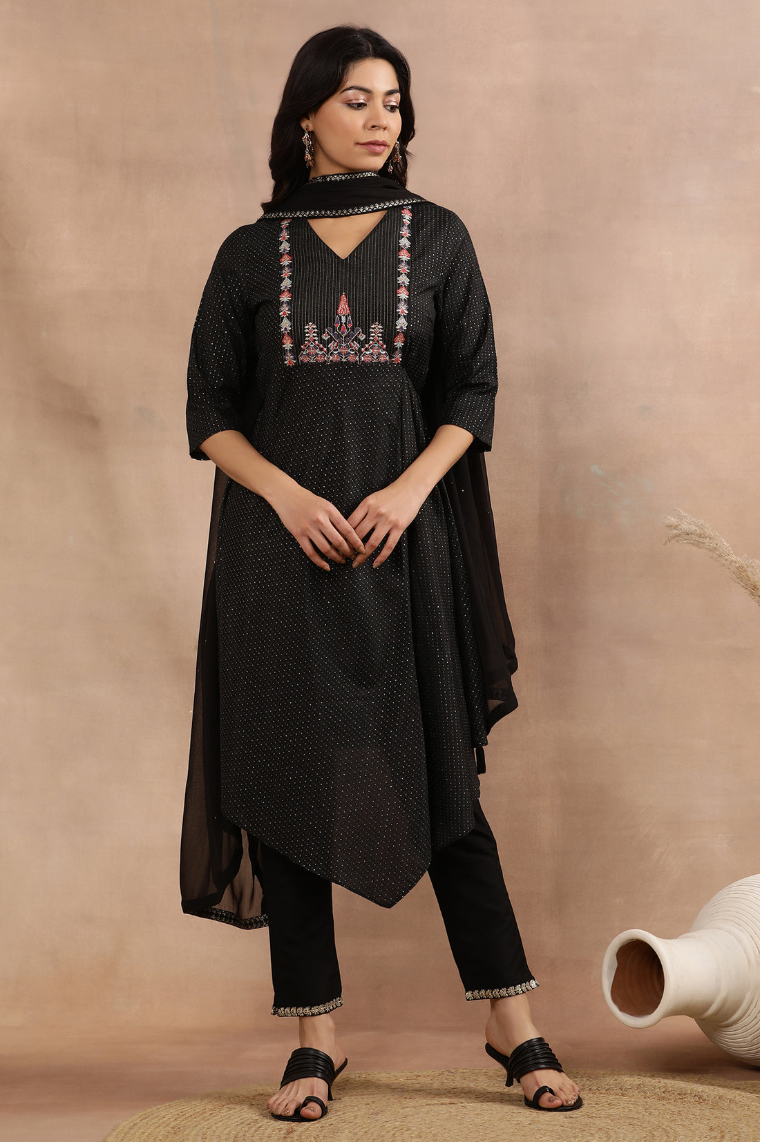 Get Stunning Look With This Beautiful Black Asymmetrical Embroidered Festive Kurta Set. The Set Has Mock Layered Kurta With Asymmetrical Hemline. It Is Paired With Black Slim Pants Which Has Embroidery On Hemline And Dupatta.
