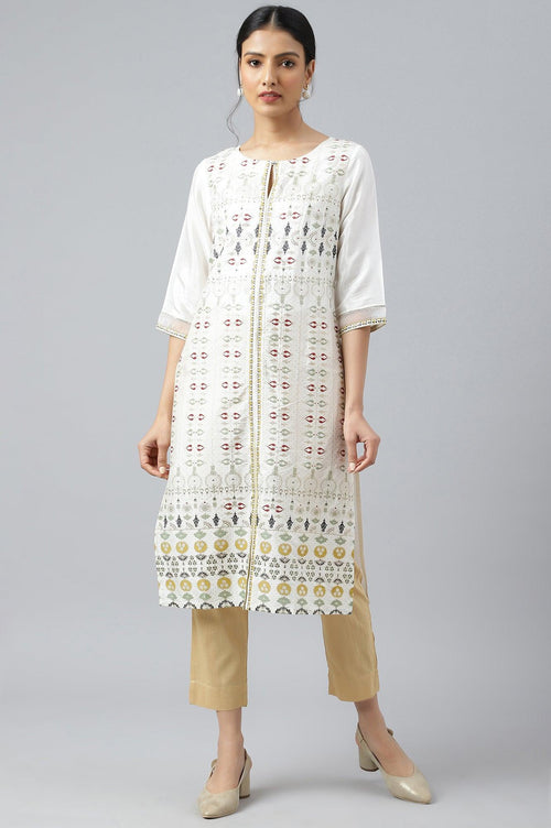 Be Festive Ready With This Pretty And Elegant Aurelia kurta Set. The Set Includes kurta Multi-Coloured kurtal, Paired With Golden Pants And White Printed Border Dupatta.