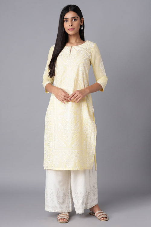 Embrace casual elegance with this stunning yellow kurta and parallel pants set. Crafted from 100% pure cotton, this ensemble offers both comfort and style for your everyday ethnic wear. The kurta features a charming keyhole neckline and three-quarter sleeves, perfect for warm weather. The woven construction ensures durability and a flattering fit. Adorned with a delightful floral print, this straight-cut kurta exudes a fresh and feminine appeal. The matching parallel pants complete the look, providing ease of movement and a contemporary silhouette. Ideal for casual outings or relaxed gatherings, this ethnic ensemble combines traditional charm with modern sensibilities. The breathable cotton fabric keeps you cool and comfortable throughout the day, making it a versatile addition to your wardrobe. Whether you're running errands or meeting friends for lunch, this yellow floral printed kurta set is sure to make a stylish statement while keeping you at ease.