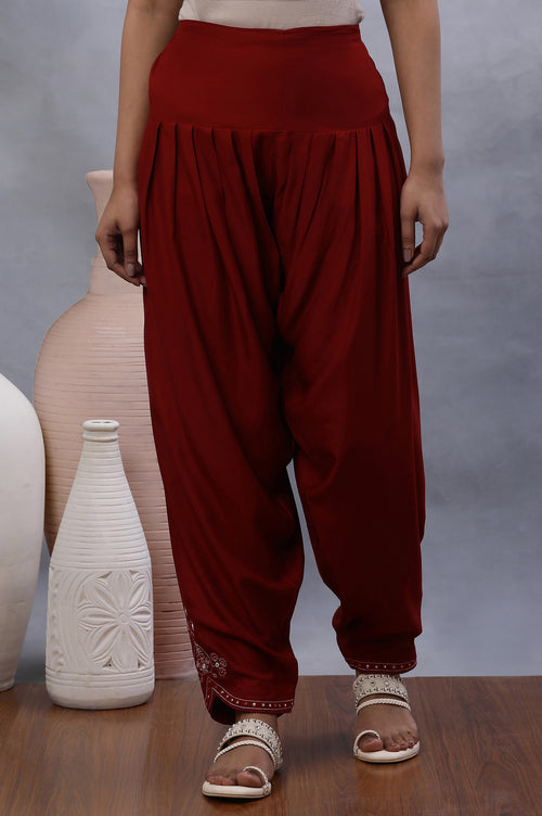 This Beautiful Solid Red Salwar Is The Great Option For Your Festive Wardrobe.It Features Interesting Modern Paisley Motifs Embroidery Along With Silver Mirror Work. It Has Shaped Hem Complimented With Printed Facing.