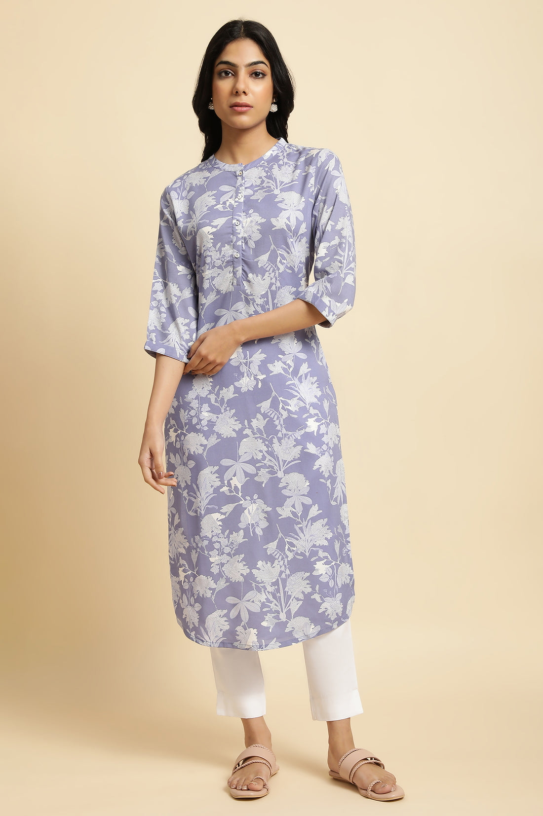 Blue Floral Printed Straight kurta In Mandarin Collar And Half Button Placket. Crafted In Rayon, This kurta Is A Perfect Pick For Casual Day Out.