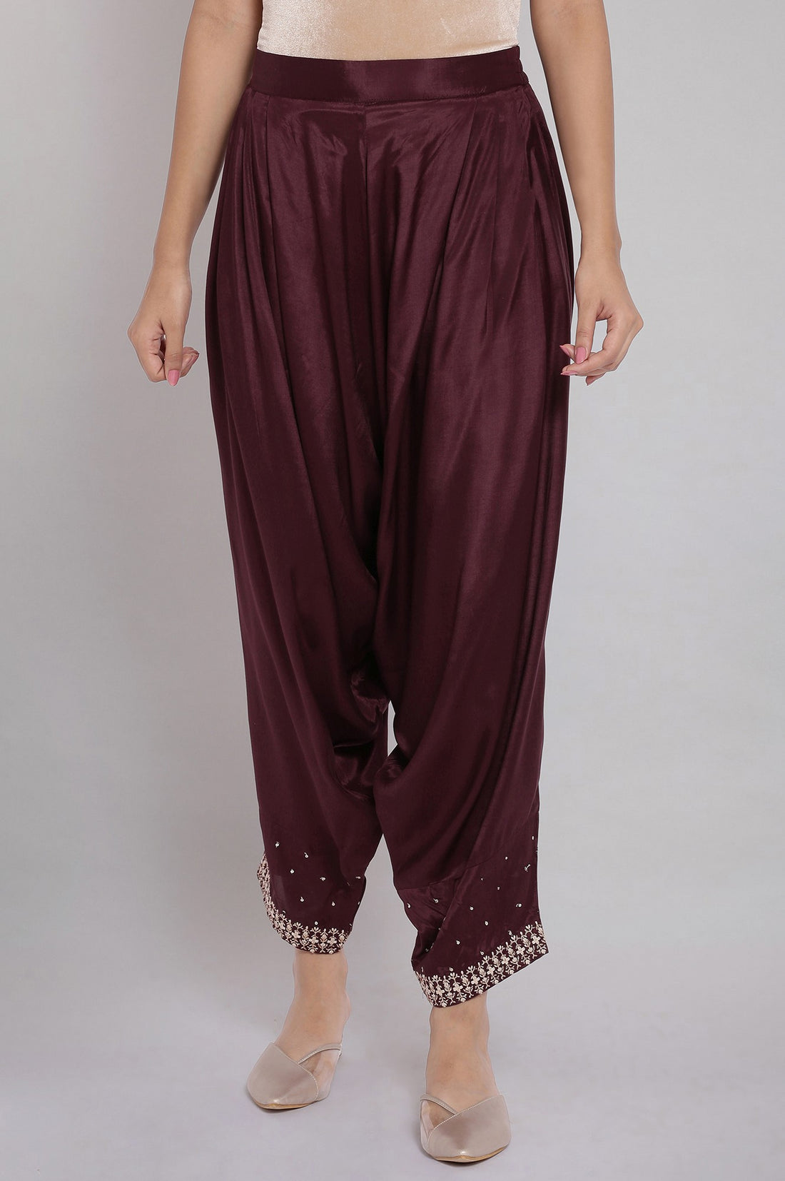 Wine coloured solid drape pants featuring sequin embellishment and thread embroidery. It comes with a partially elasticated waistband.
