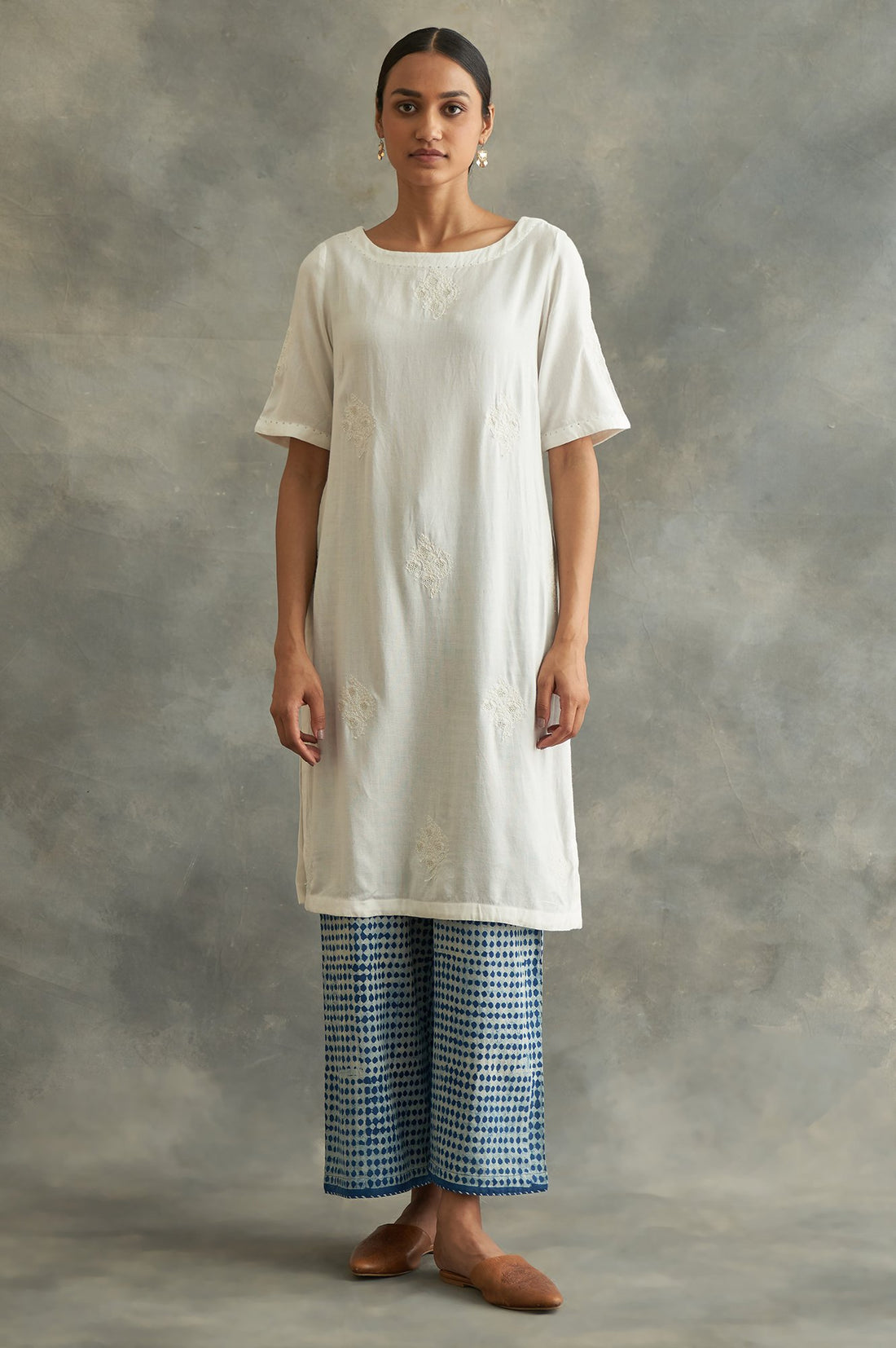 Discover the perfect blend of comfort and style with this white embroidered kurta. Designed for elevated occasions, this ethnic piece features a straight cut and a classic round neckline, making it suitable for various body types. The elbow-length sleeves offer a contemporary touch to the traditional silhouette. Crafted using a woven construction technique, the kurta is made from a luxurious blend of 92% viscose and 8% flax, ensuring breathability and a soft feel against the skin. The intricate embroidery adds a touch of elegance and sophistication, making it an ideal choice for special events or festive celebrations. This versatile garment can be easily styled with different bottoms and accessories to create multiple looks. The rayon flax fabric provides a subtle sheen and drape, enhancing the overall appeal of the kurta. Whether you're attending a cultural function or a formal gathering, this embroidered kurta will help you make a lasting impression while keeping you comfortable throughout the event.