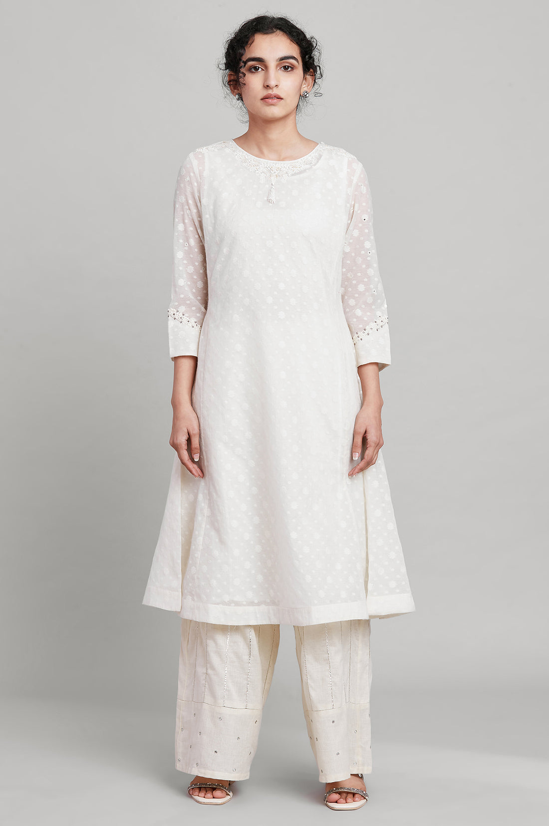 Elevate your ethnic wardrobe with this exquisite white A-line kurta. Crafted from a comfortable blend of 80% cotton and 20% polyester, this three-quarter sleeve garment offers both style and breathability. The round neckline adds a touch of elegance, while the intricate embroidery work showcases fine craftsmanship. Perfect for elevated occasions, this woven kurta features a full cotton lining for added comfort. The A-line silhouette flatters various body types, making it a versatile addition to your wardrobe. Embrace your cultural heritage with this stunning piece that seamlessly blends traditional design with modern aesthetics. Pair it with stylish sandals to complete the look, exuding effortless elegance. Versatile and timeless, this outfit is perfect for making a statement at any occasion, day or night.