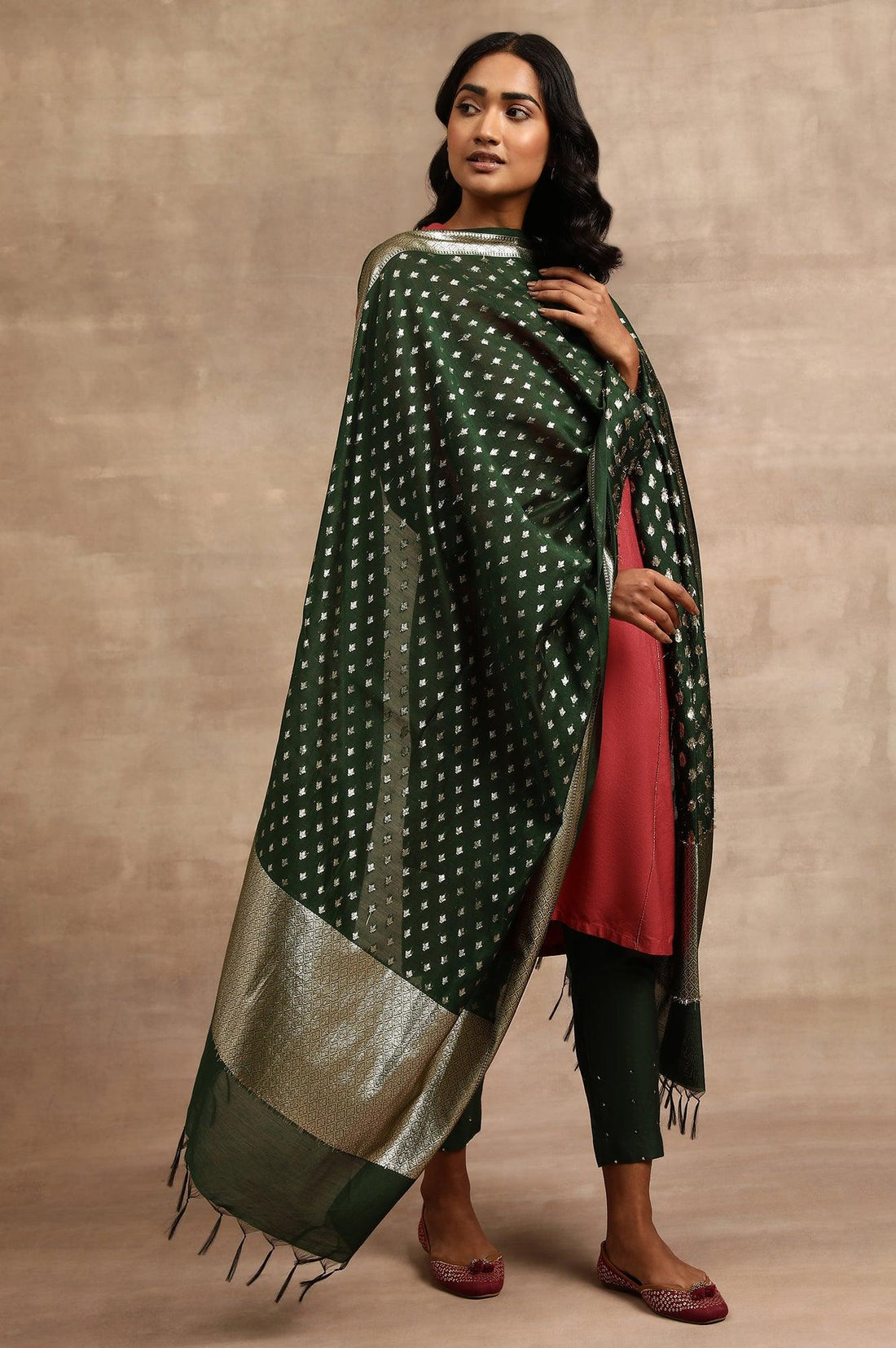 Create A Tonal Heavy Festive Look By Pairing This Drape With Green Jacquard kurta And Slim Pants.
