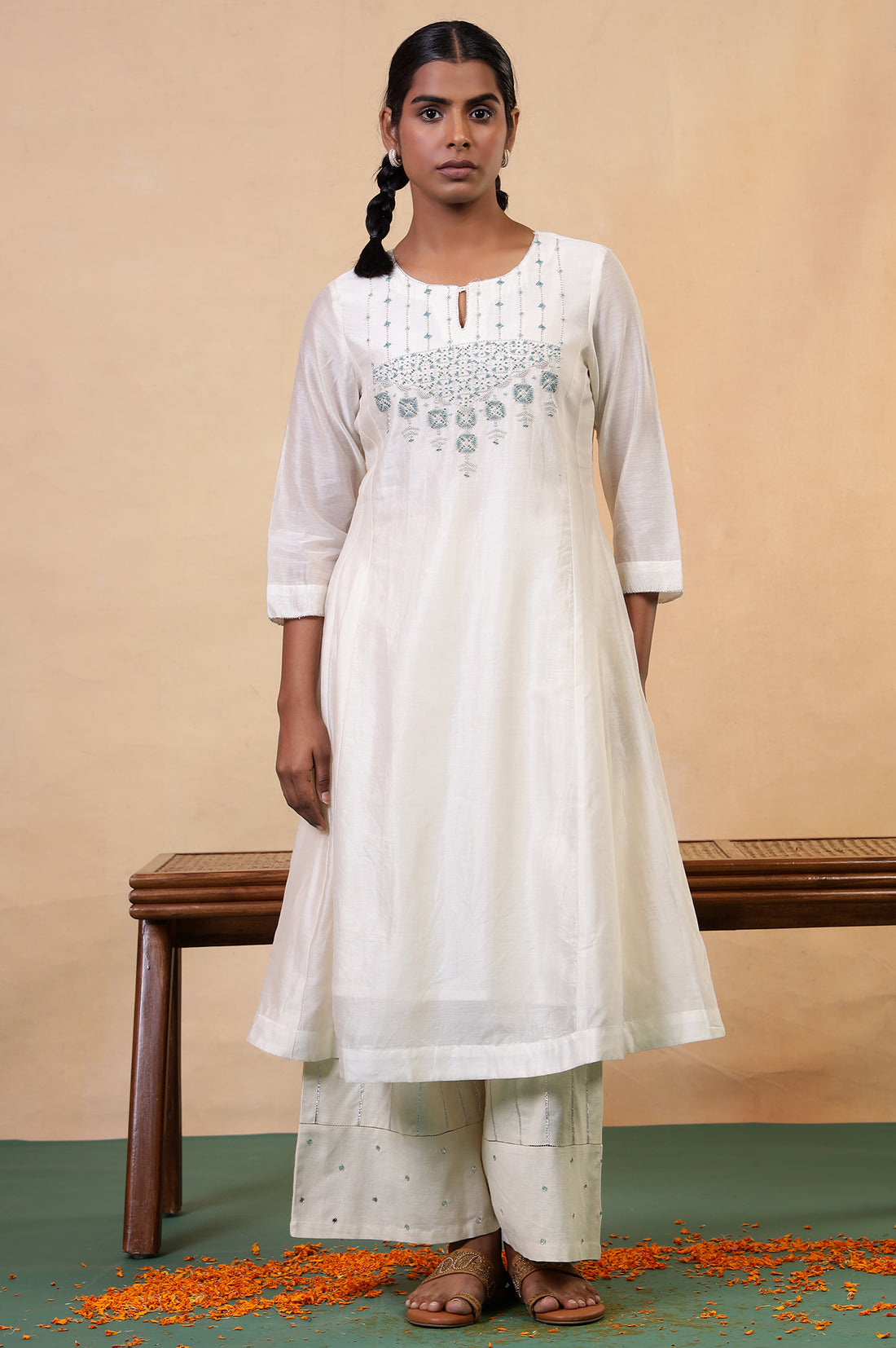 Elevate your party look with this stunning off-white anarkali kurta from Folksong. Crafted from a luxurious cotton-silk blend (82% Cotton, 18% Silk), this women's kurta combines comfort and elegance. The round neckline and three-quarter sleeves add a touch of sophistication, while the flared style creates a graceful silhouette. Perfect for special occasions, this solid-colored kurta exudes timeless charm. The absence of surface styling allows the beautiful fabric to take center stage, making it a versatile piece for various party settings. Folksong's attention to detail and quality craftsmanship shine through in this exquisite anarkali kurta, ensuring you'll stand out at any gathering.
