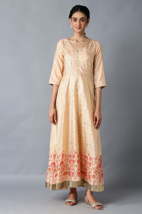 Peach Floral Printed Long Flared Dress
