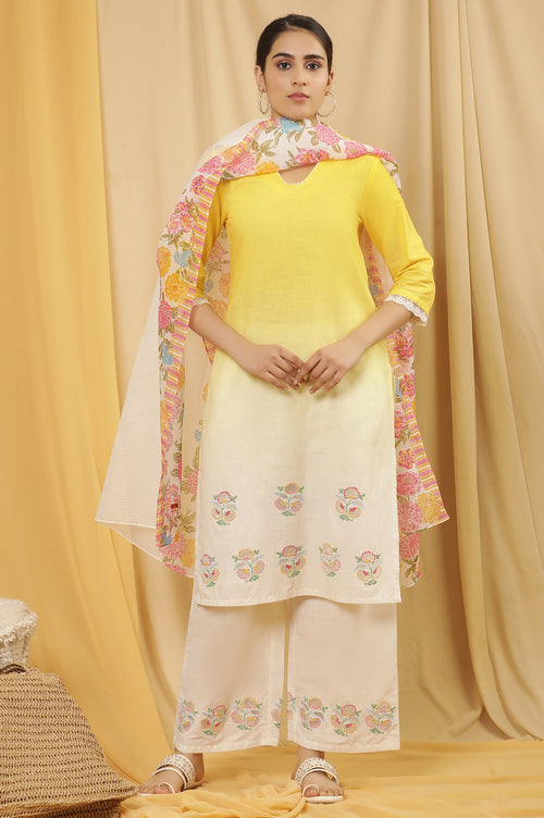 Elevate your ethnic wardrobe with this stunning yellow kurta set. The ensemble features a kurta, parallel pant, and dupatta, all crafted from pure cotton for ultimate comfort. The kurta boasts a beautiful floral print, adding a touch of feminine charm to the outfit. Its straight cut and v-neck design create a flattering silhouette suitable for various body types. The three-quarter sleeves offer a perfect balance between style and practicality, making it ideal for casual wear. This woven ethnic set is perfect for women who appreciate traditional fashion with a modern twist. The 100% cotton composition ensures breathability and ease of movement, making it an excellent choice for warm weather. Whether you're attending a family gathering or a casual outing with friends, this versatile kurta set will keep you looking effortlessly stylish and feeling comfortable throughout the day.