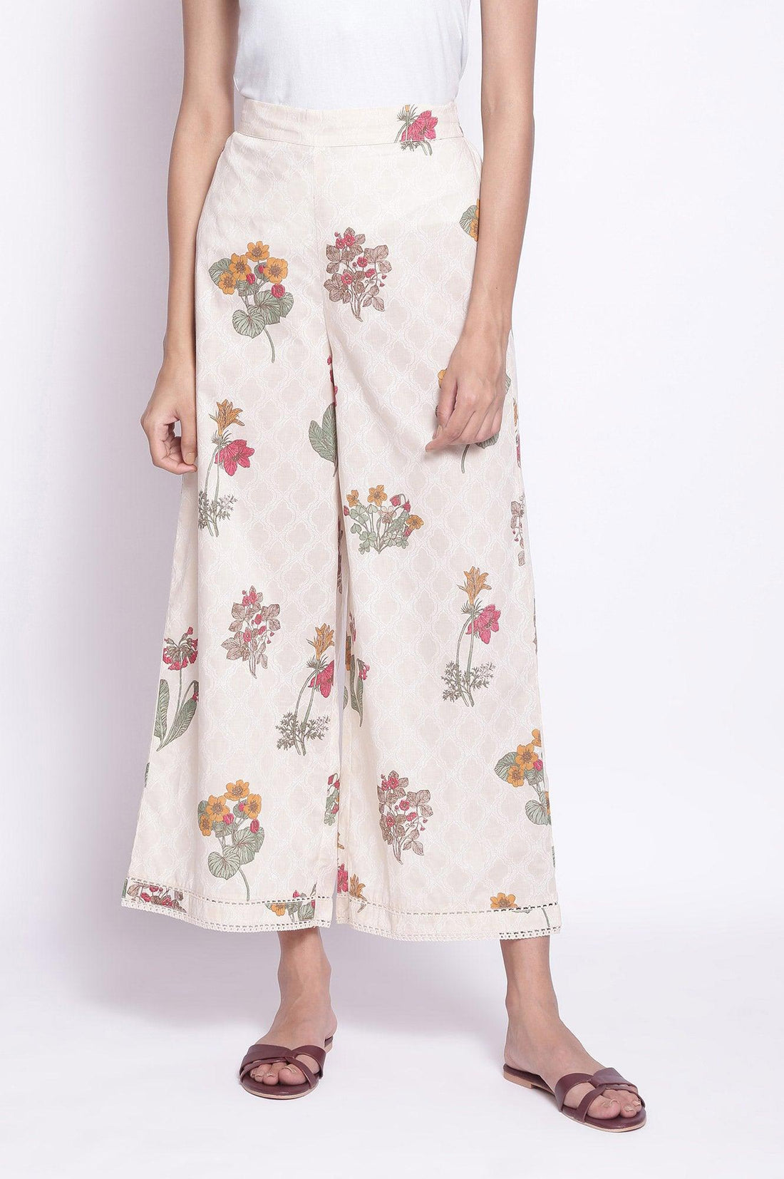 Ecru all-over floral printed flared parallel pants in mid-rise and partially elasticated waistband.