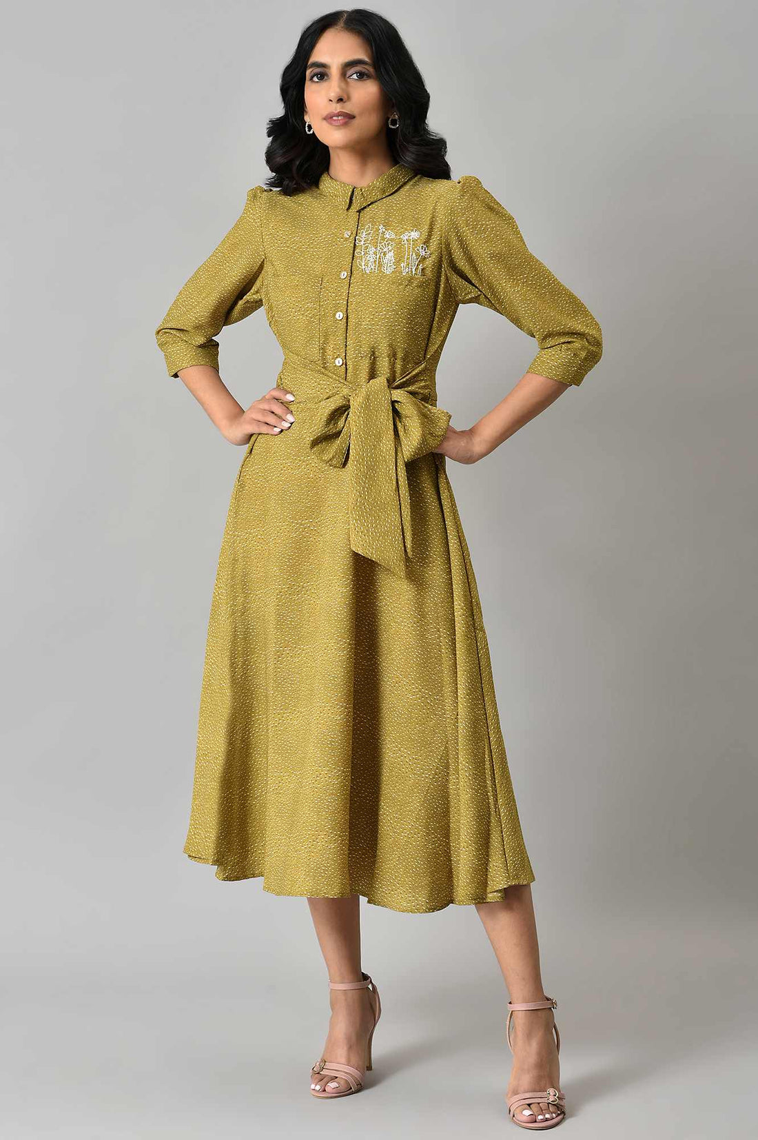 Mustard Green Printed Long Shirt Dress With Waist Tie Belt And Floral Embroidery Detail