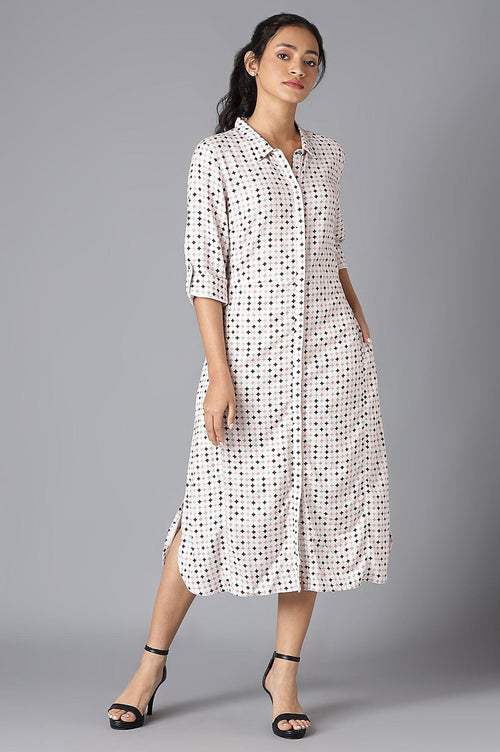 For The Minimal And Statement Look, Get This Light Pink Geomtric Print Shirt Dress. Step Out This Summer Wearing This Stunning Western Dress By W. Tailored In A-Line Silhouette, It Features 2-Side Pockets And Roll-Up Sleeves.