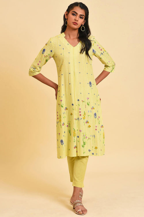 Get Your Summer-Ready Look With This Pretty Green kurta Set. The Set Includes V-Neck Straight kurta In Floral Print And It Is Paired With Green Solid Slim Pants In Mid-Rise.