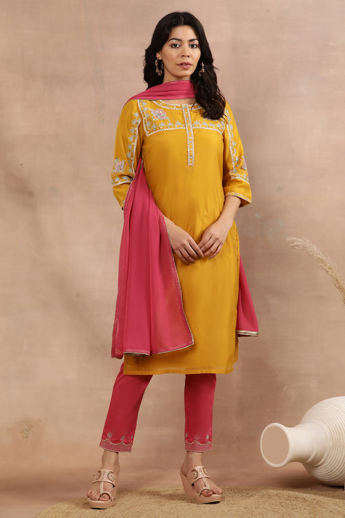 Elevate your ethnic wardrobe with this exquisite yellow kurta for women. Crafted from a luxurious blend of 80% viscose and 20% man-made fiber, this woven chanderi kurta offers both comfort and style. The straight silhouette is adorned with intricate embroidery, adding a touch of elegance to the design. Featuring a round neckline and three-quarter sleeves, this kurta is perfect for elevated occasions. The ethnic charm of this piece is enhanced by its traditional craftsmanship, making it a versatile addition to your wardrobe. Whether paired with matching bottoms or styled with contemporary accessories, this embroidered yellow kurta is sure to make a lasting impression.