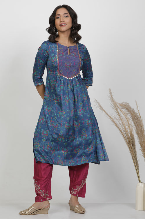 Crafted with chunky thread work and metallic sequins, the kurta has a textured yoke with stitch detailing. The simple straight silhouette has a colourful print inspired from suzani motif.
