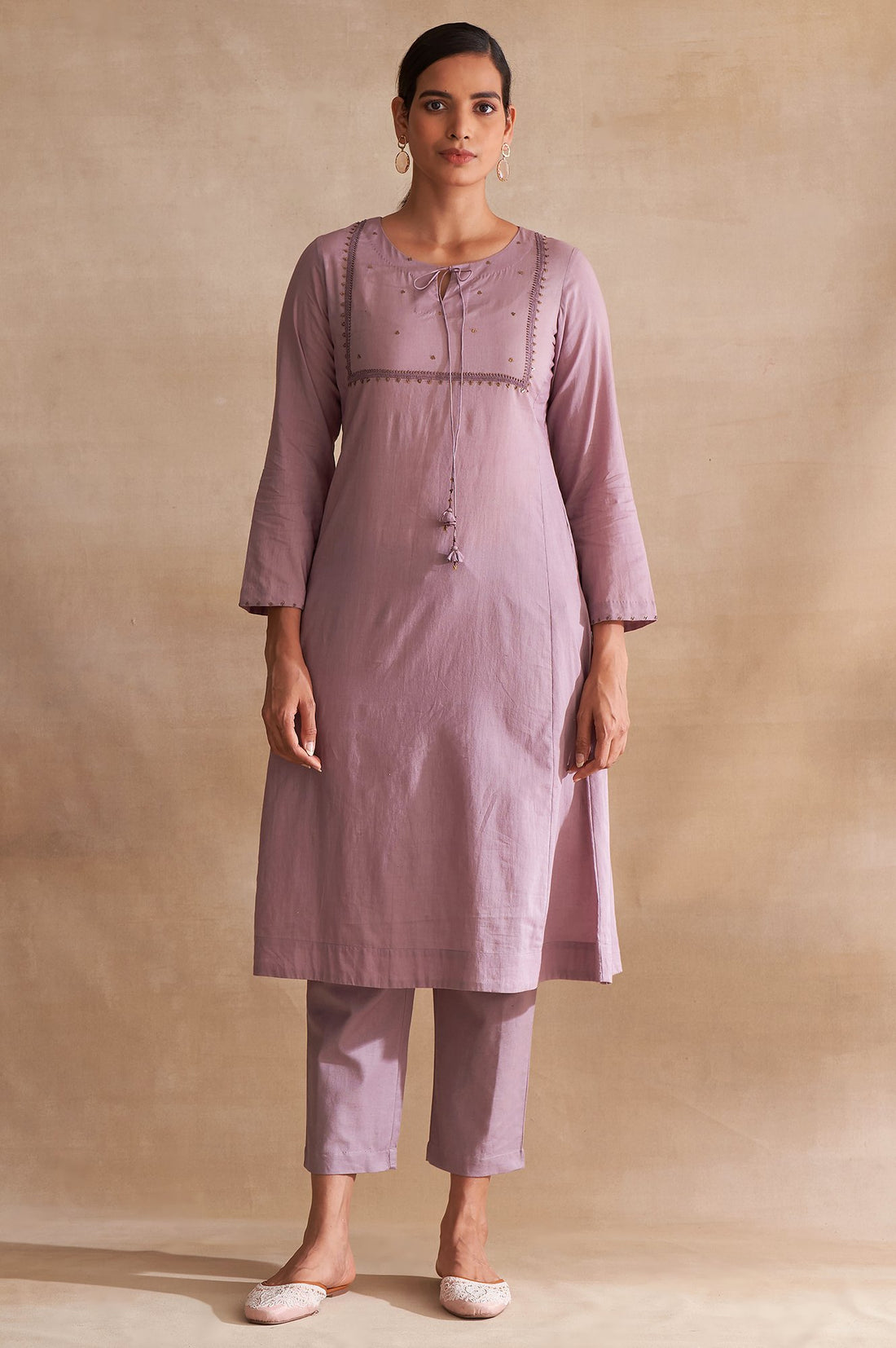 A Flared Round Neck kurta In Soft Voile, Features Intricate Hand Done Metallic Embroidery At Front And Back, Includes Pretty Floral Tassel At Tie-Up.