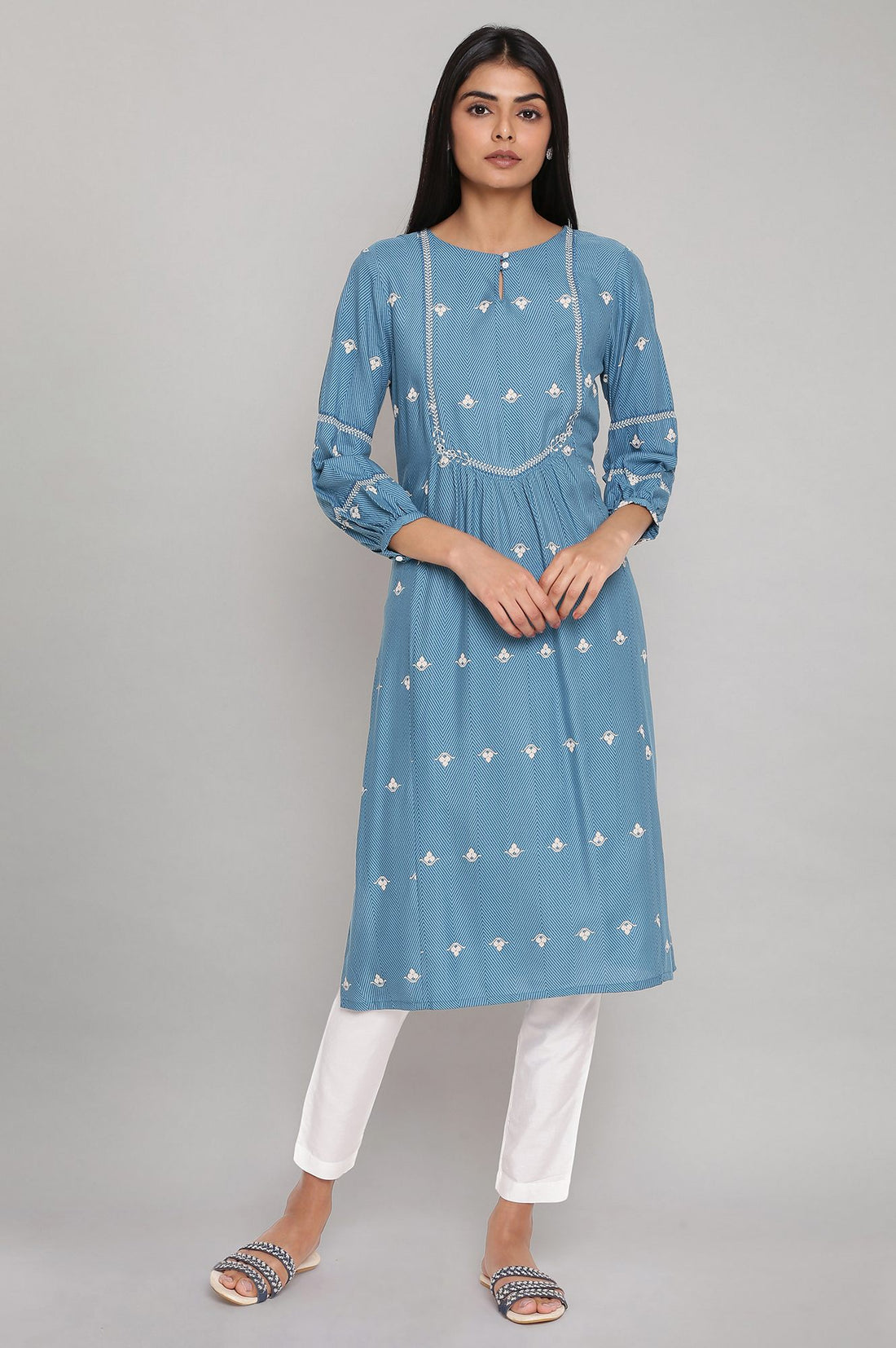 Adriatic blue geometric print kurta keyhole neckline and gathered three-quarter sleeves. It also features slight gathers at front and embroidered yoke.