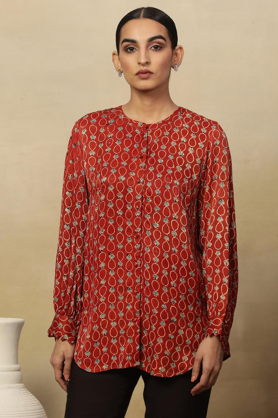 A Brick Red Ajrakh Block Printed Top With Mandarin Collar And Front Placket Opening. It Features Gathered Sleeves With Origami Triangle Detail.