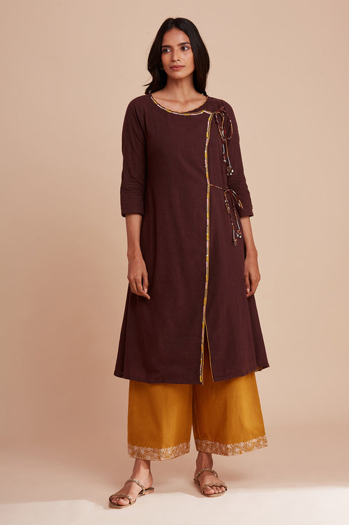 Wrap style A-line kurta with multi-coloured thread embroidery and tie-up with pretty tassels.