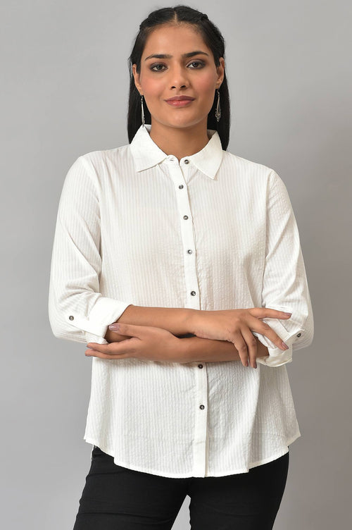 Discover the perfect blend of comfort and style with this fusion-inspired women's top. Crafted from 100% pure cotton, this a-line shirt boasts a sophisticated yarn-dyed design, ensuring a rich and lasting color. The spread neckline adds a touch of elegance, while the full sleeves provide versatility for various occasions. Ideal for casual outings, this woven white top combines timeless appeal with modern sensibilities. Its breathable cotton construction guarantees all-day comfort, making it a must-have addition to any wardrobe. Whether paired with jeans for a relaxed look or dressed up with accessories, this versatile piece effortlessly elevates your everyday style. Pair it with stylish sandals to complete the look, exuding effortless elegance. Versatile and timeless, this outfit is perfect for making a statement at any occasion, day or night.
